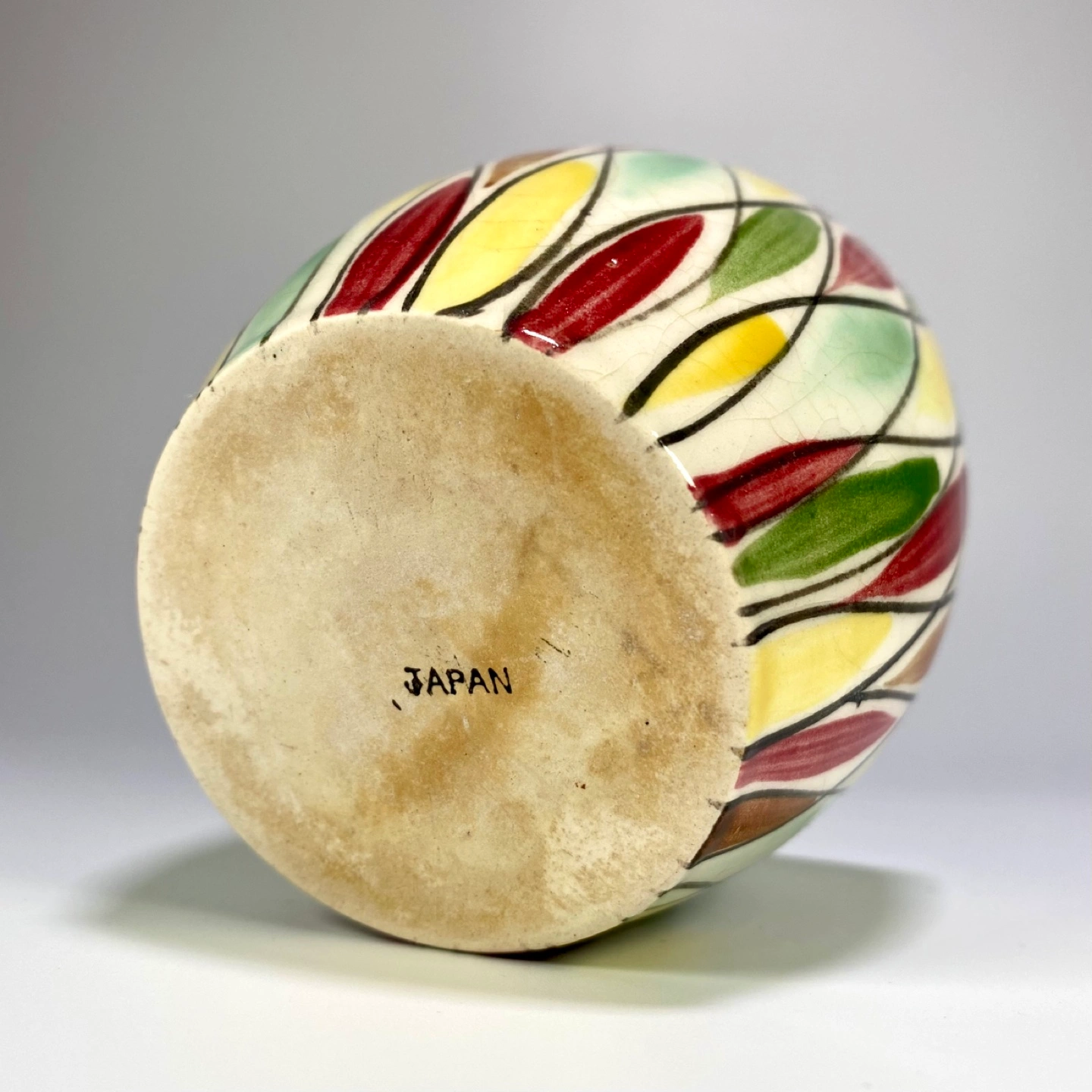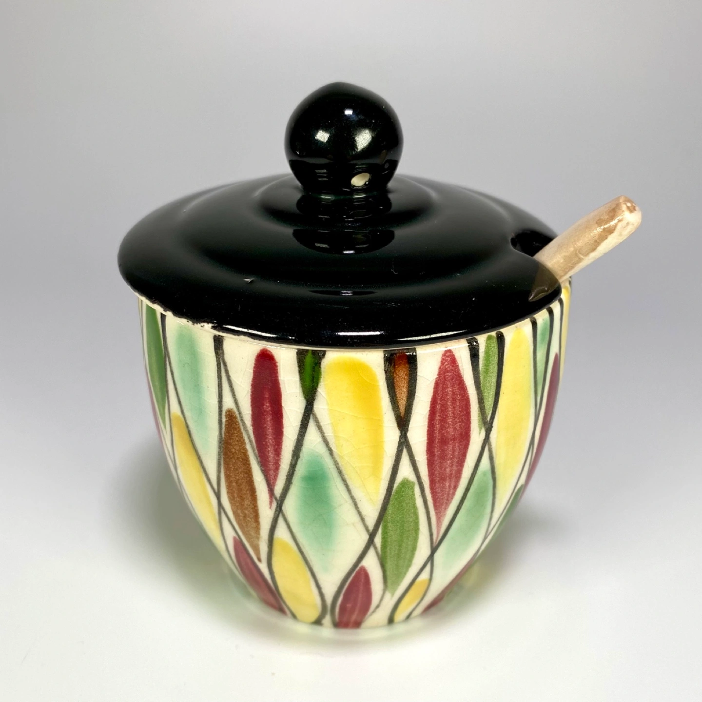 Vintage harlequin-patterned lidded ceramic sugar bowl with spoon, made in Japan.