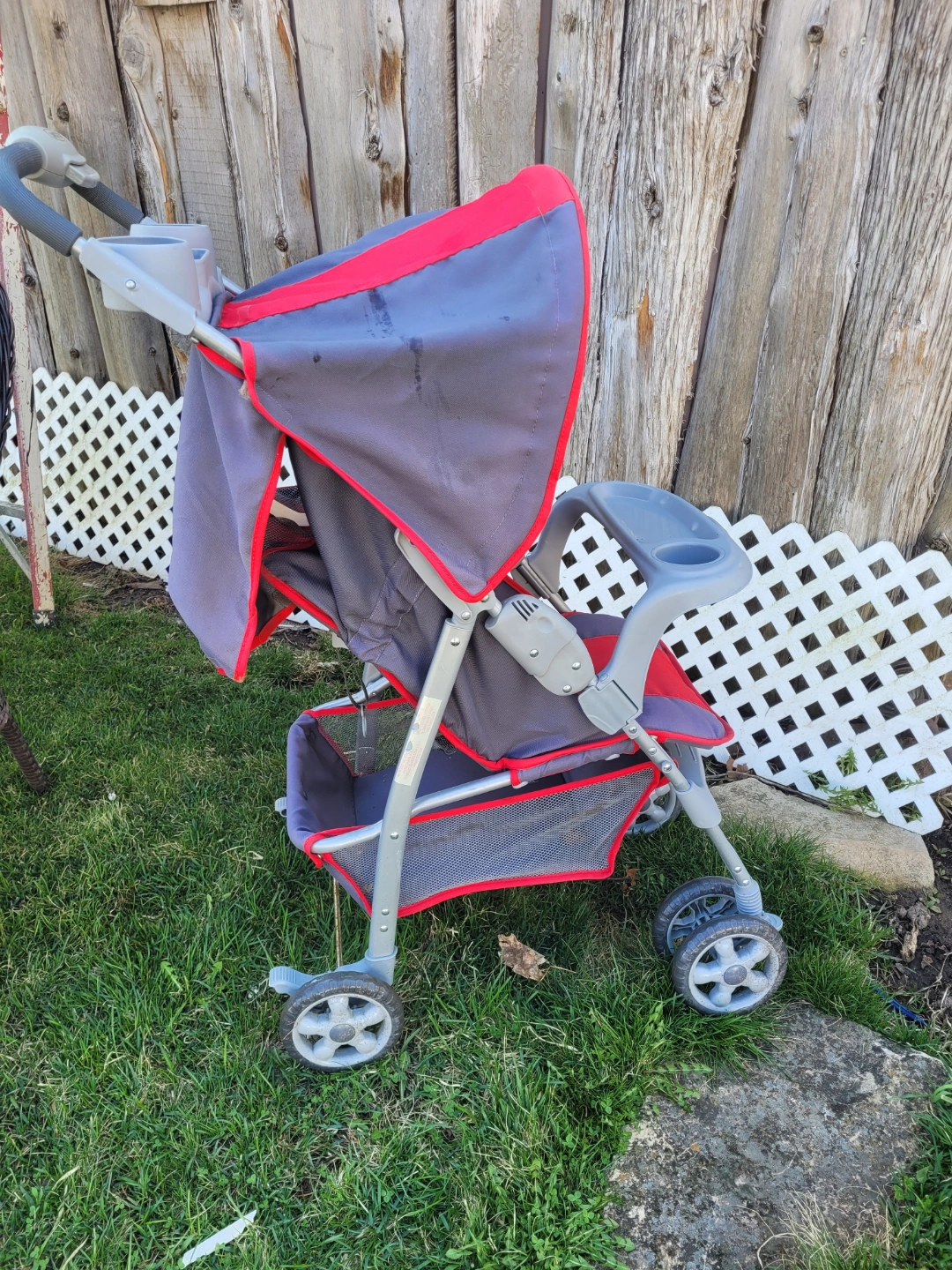 Used Avalon stroller. Grey and red colour scheme. Features cup holders and a storage basket. Lightweight and easy to fold. Some wear and tear.