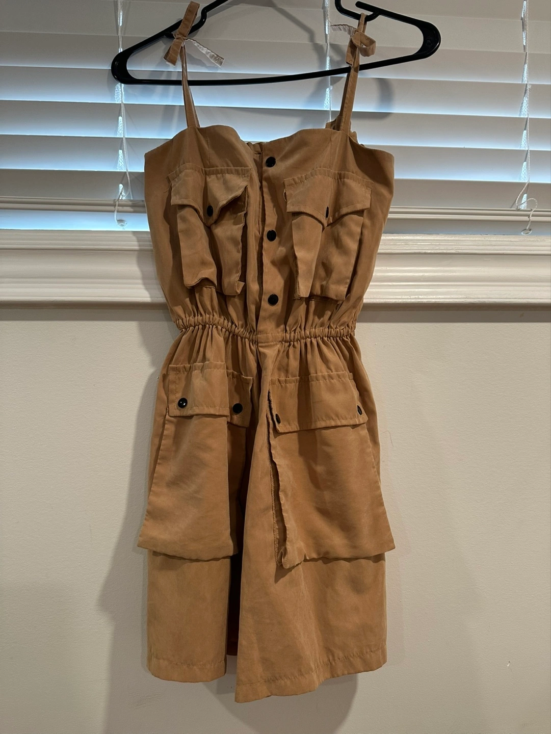 Adorable mini dress with skort. Features multiple pockets and adjustable straps. Lightweight fabric, perfect for summer. Button closure.