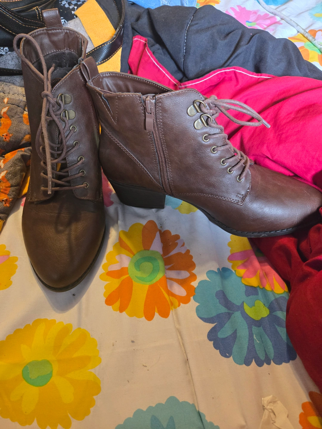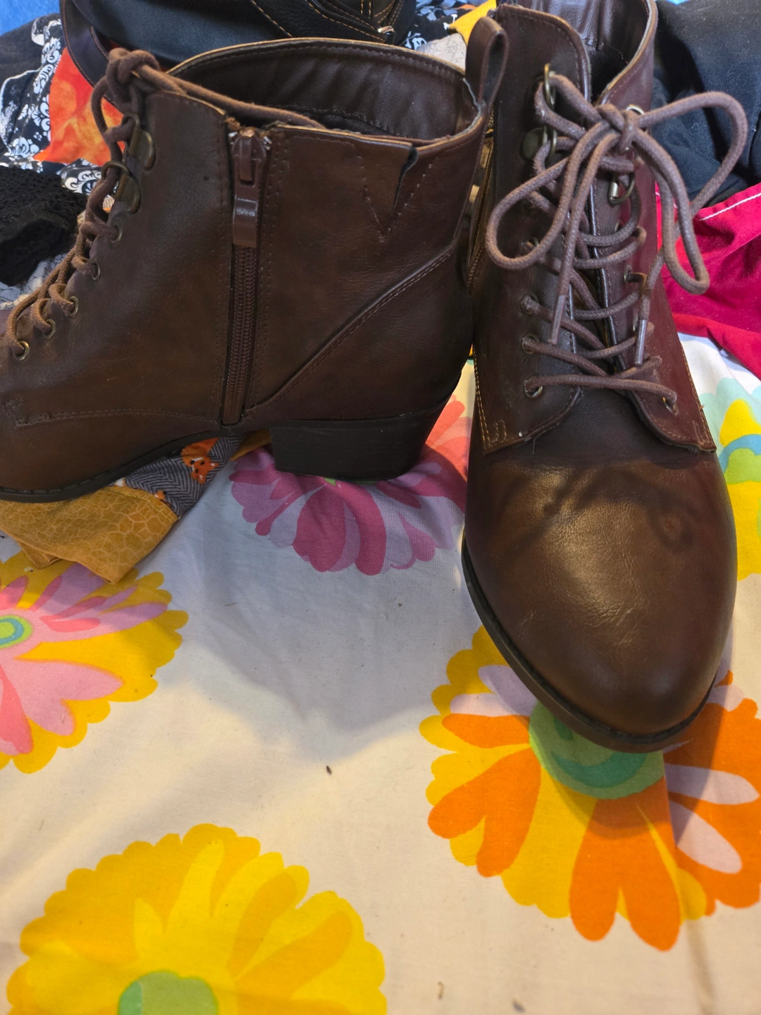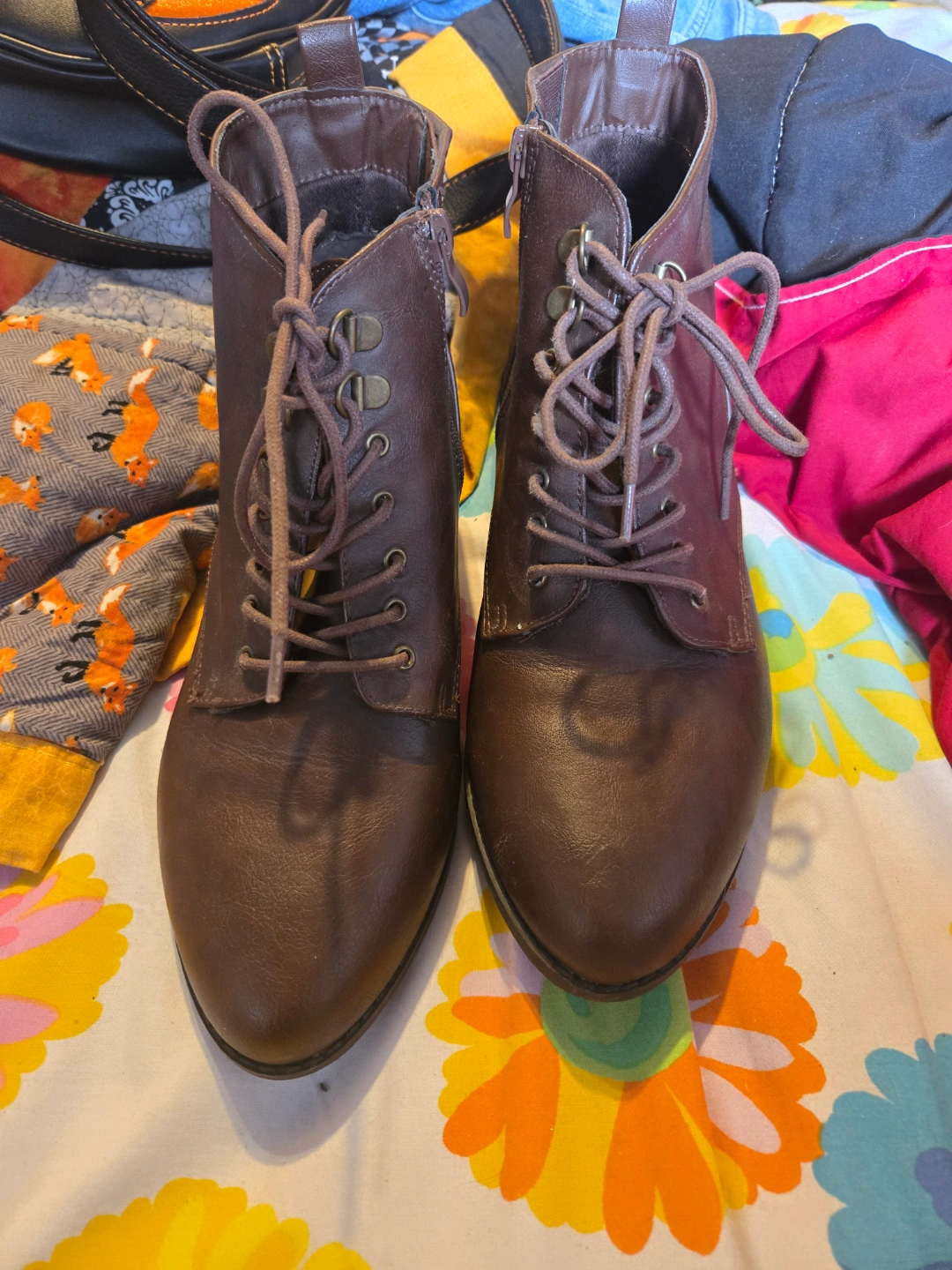 43Brown leather ankle boots. Lace-up closure and side zipper. Low block heel. Pre-owned. size 10.5 wide width, would fit a size 11 foot easily. worn out literally once; smoke free, pet friendly home.