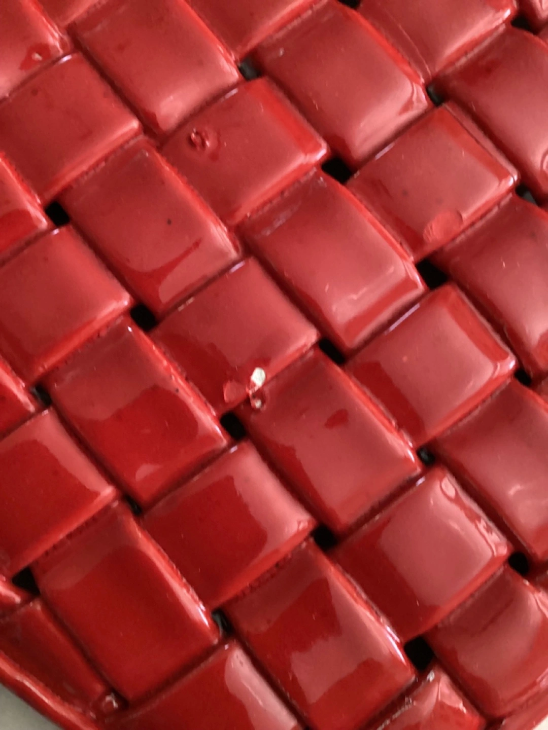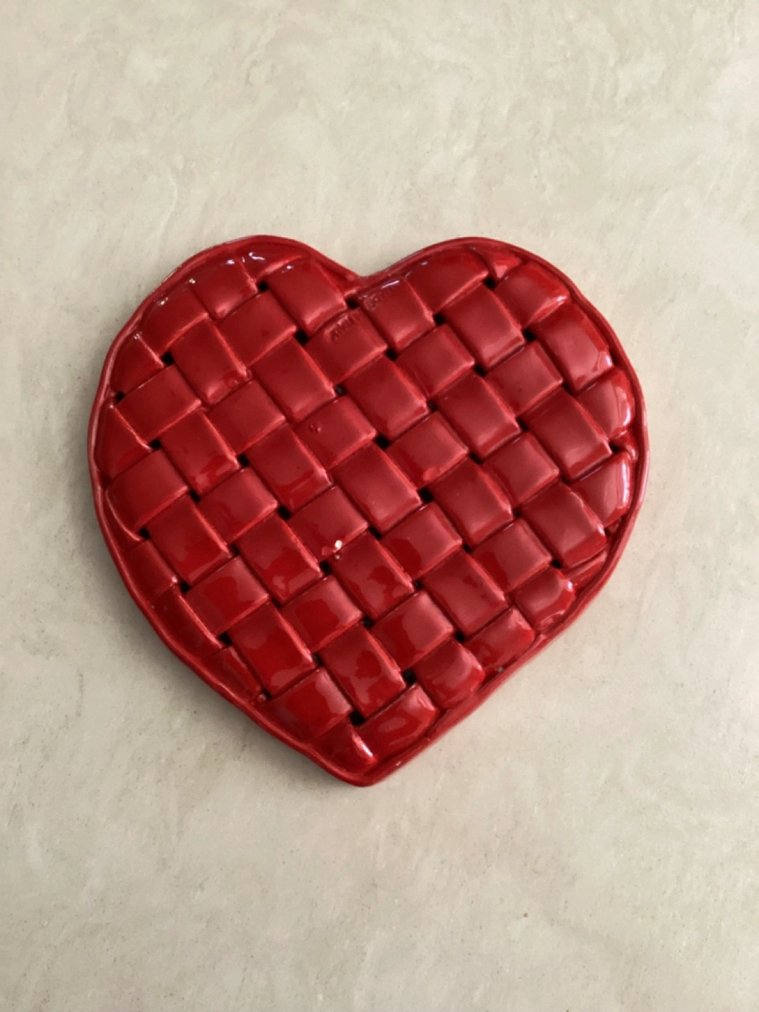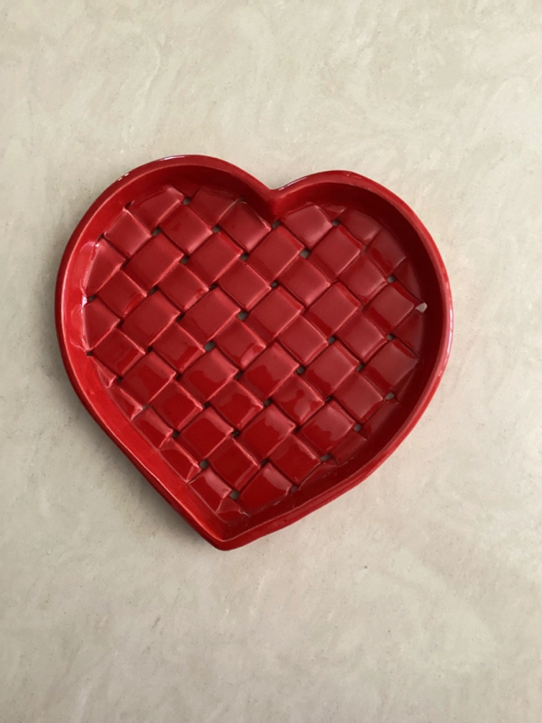 Heart-Shaped Decorative Dish, made in Italy, it has holes in it because of the basket-weave pattern, these holes make it look like it has chips but that is not the case, the only chip is on the back which is not visible.