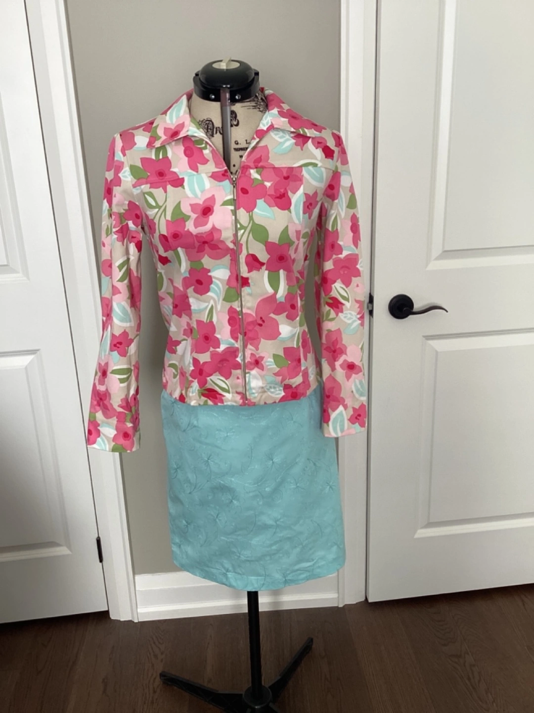 Y2K Cleo Petite Skirt Set, centre front zip closure, freshly laundered, jacket is size 4 and skirt is size 6, only issue is faint small stain on the back of the jacket - see last pic, 97% Cotton 3% Spandex. $15 or best offer.