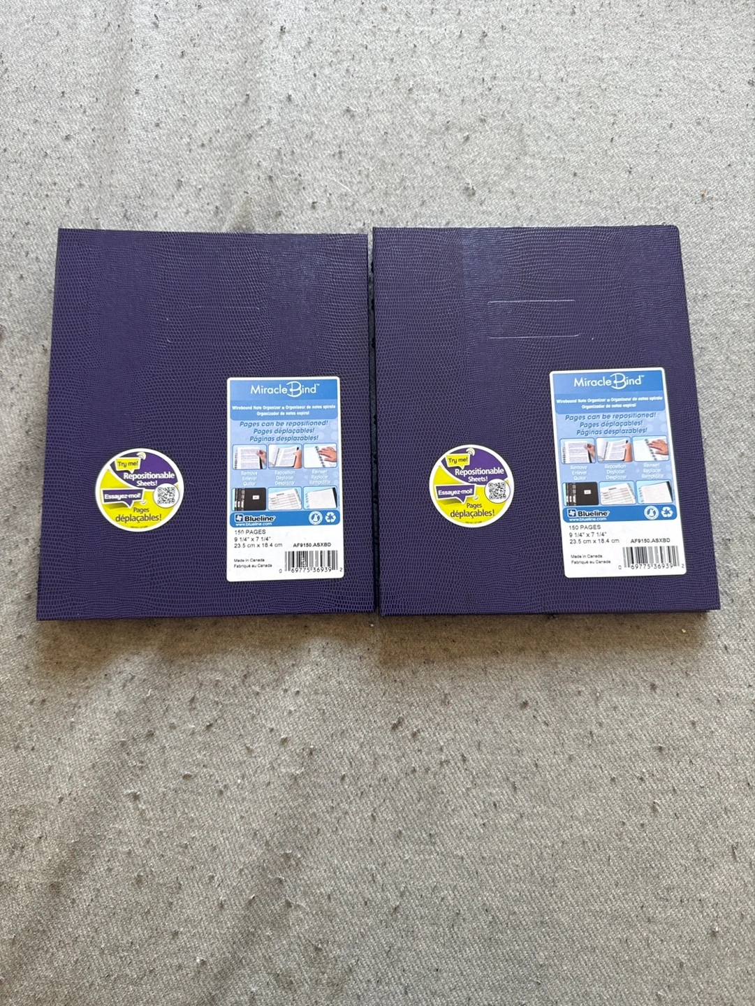 32Two purple notebooks. 150 pages each. Pages can be repositioned. 9 1/4" x 7 1/4". Made in Canada. $5.00 each