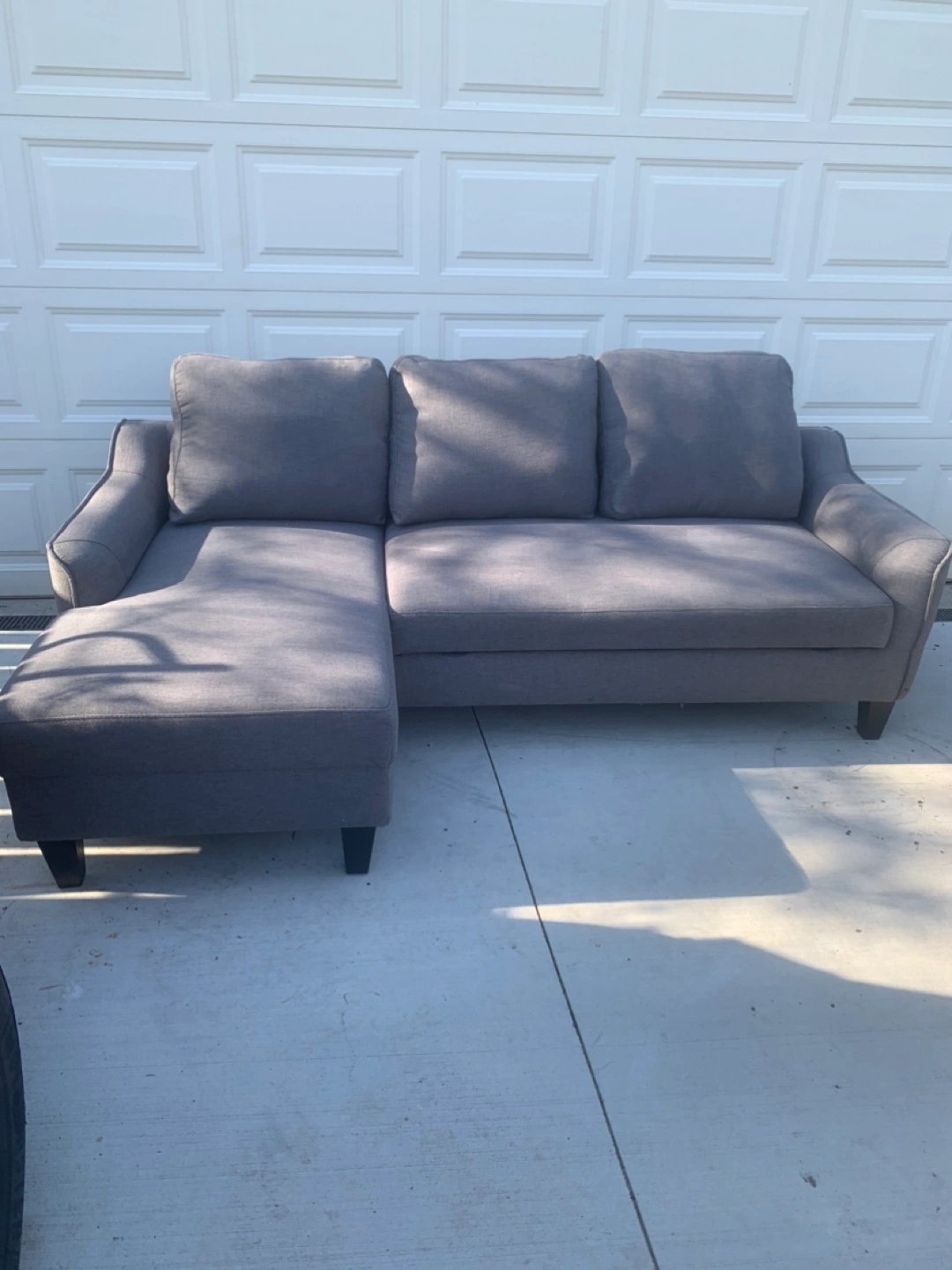 Comfortable grey fabric sectional sofa. Features three back cushions and a chaise lounge. Dark brown legs. Great for living room or family room.