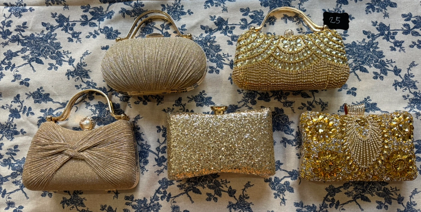 Beautiful gold clutches and evening bags. Various styles and embellishments. Perfect for weddings, parties, or special occasions. Many have metallic finishes. Some feature rhinestones and beaded accents.