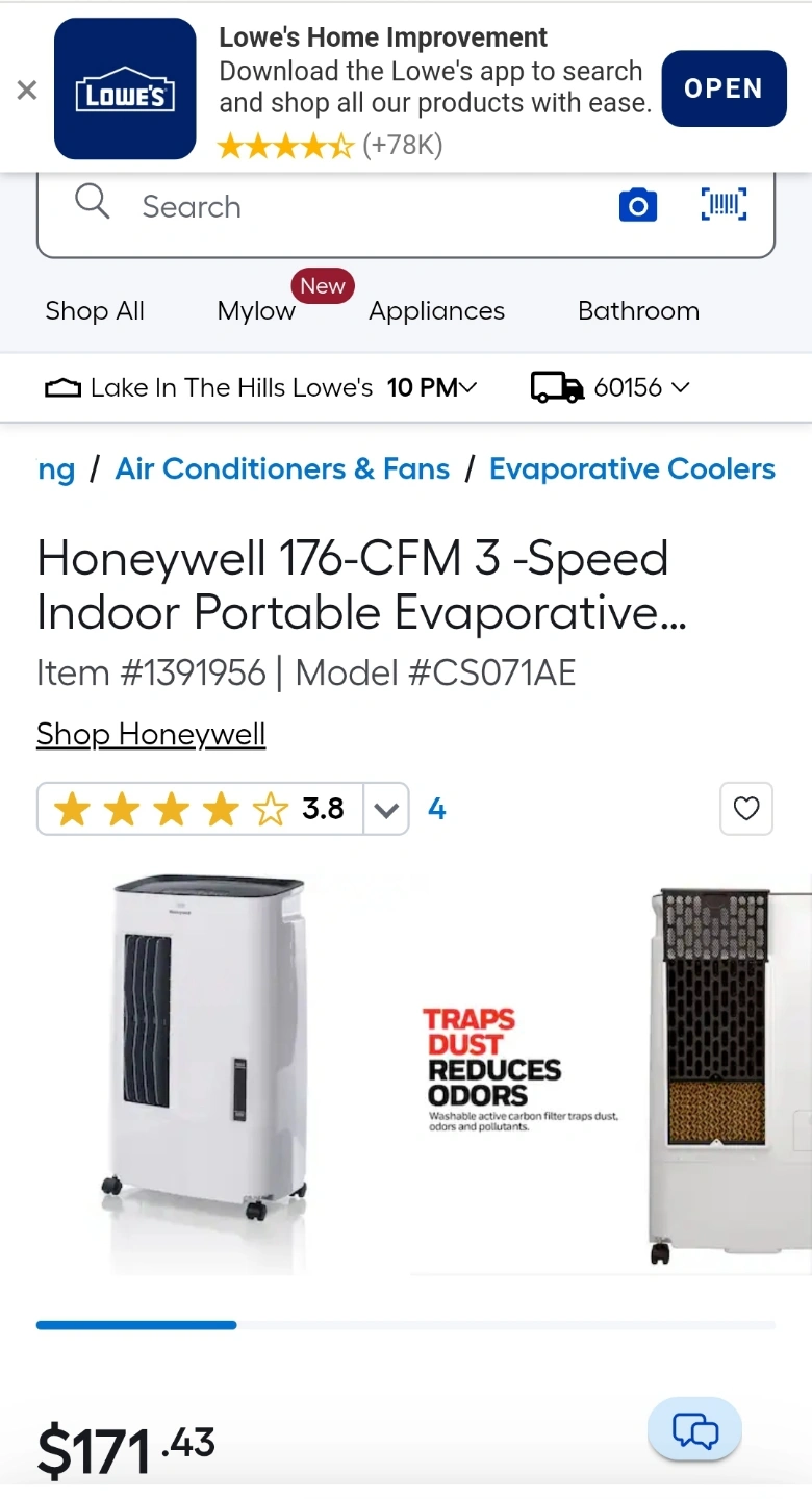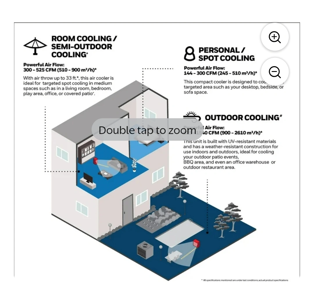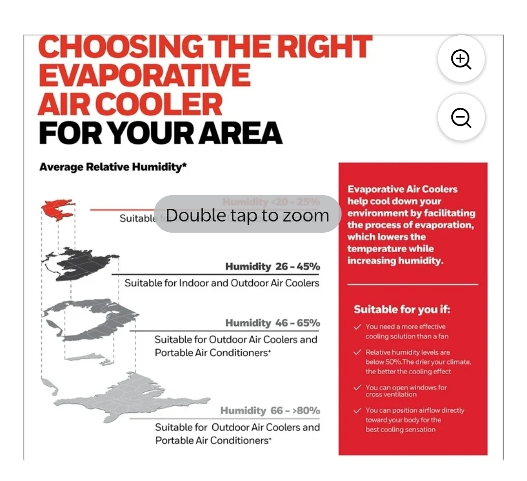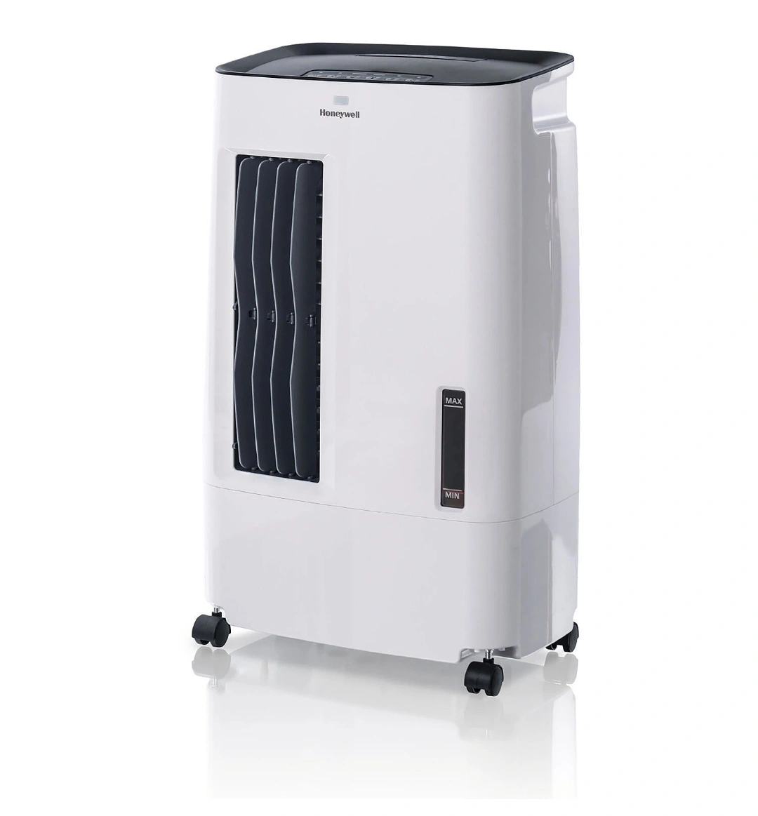 65Honeywell CS071AE Evaporative Air Cooler For Indoor Use in Small Rooms - 176 CFM, 1.8 Gallon Tank, White Ideal for use in the southwest and Midwest regions of the US Performs best in hot/dry climates where humidity levels are <50% Not just a Fan - Air Cooler reduces temperature through water evaporation Ideal for spot cooling small areas such as bed, desk area, sofa, dining table Moist, cool breeze can cool you down & be used as humidification during winter months Super low power consumption of only 50 watts 3-in-1 Cooling, Humidification & Fan Cools like a fresh breeze flowing across a lake Remote control, automatic louvers & energy saving timer Natural Energy efficient cooling with no compressor. Cools up to 100 sq. ft. (9 sq. m.) Honeycomb cooling media for optimal cooling and Carbon-dust filter cleans the air while it cools. Classy design, compact structure, lightweight & super-low power consumption. Wheels included for easy mobility. 0.5 to 7.5 hrs. auto shut-off timer. Water tank capacity of 7 Liters or 1.8 gallons. 3 speed settings - High, Medium and Low NEW with WARRANTY EASY FINANCING AVAILABLE