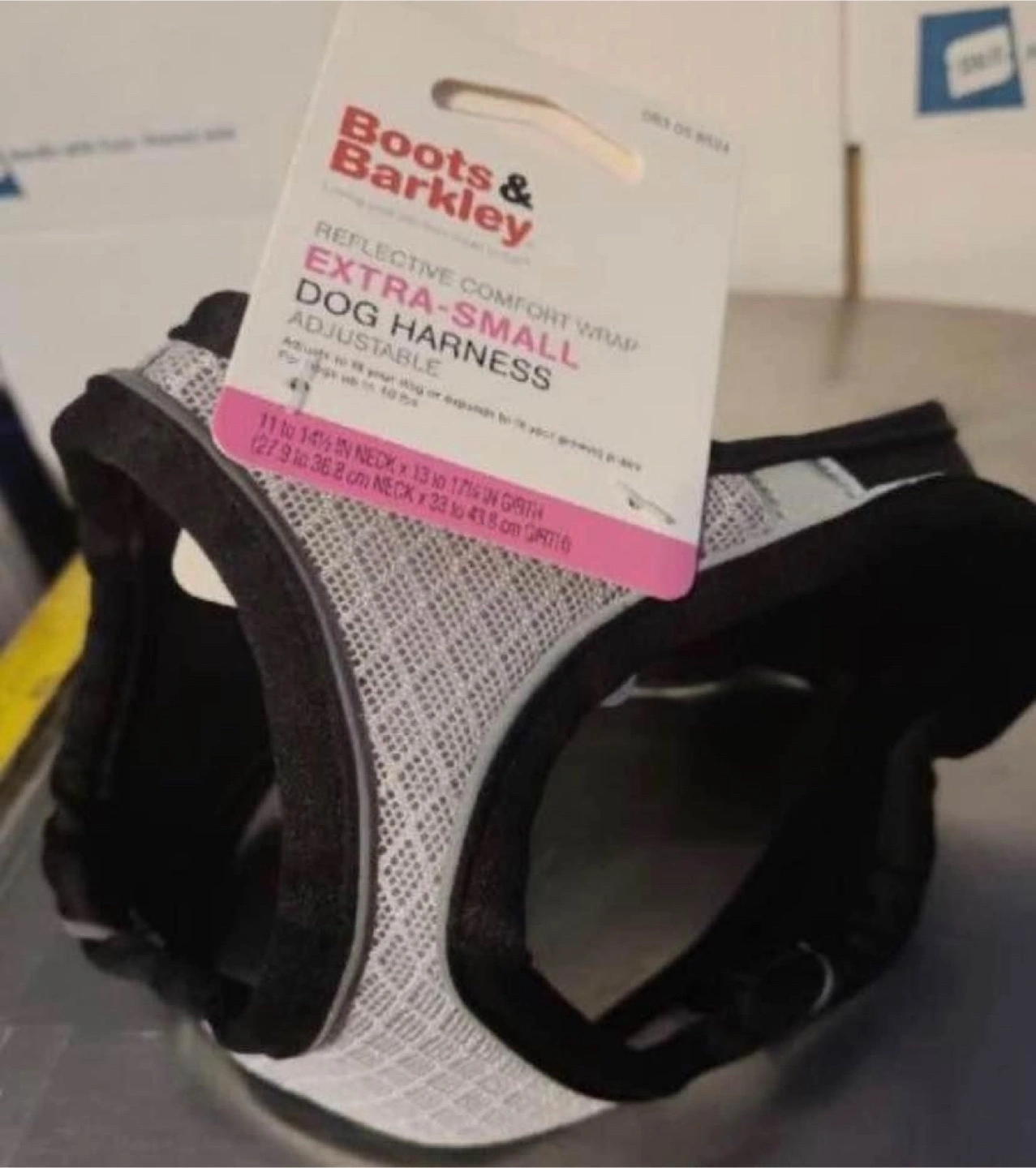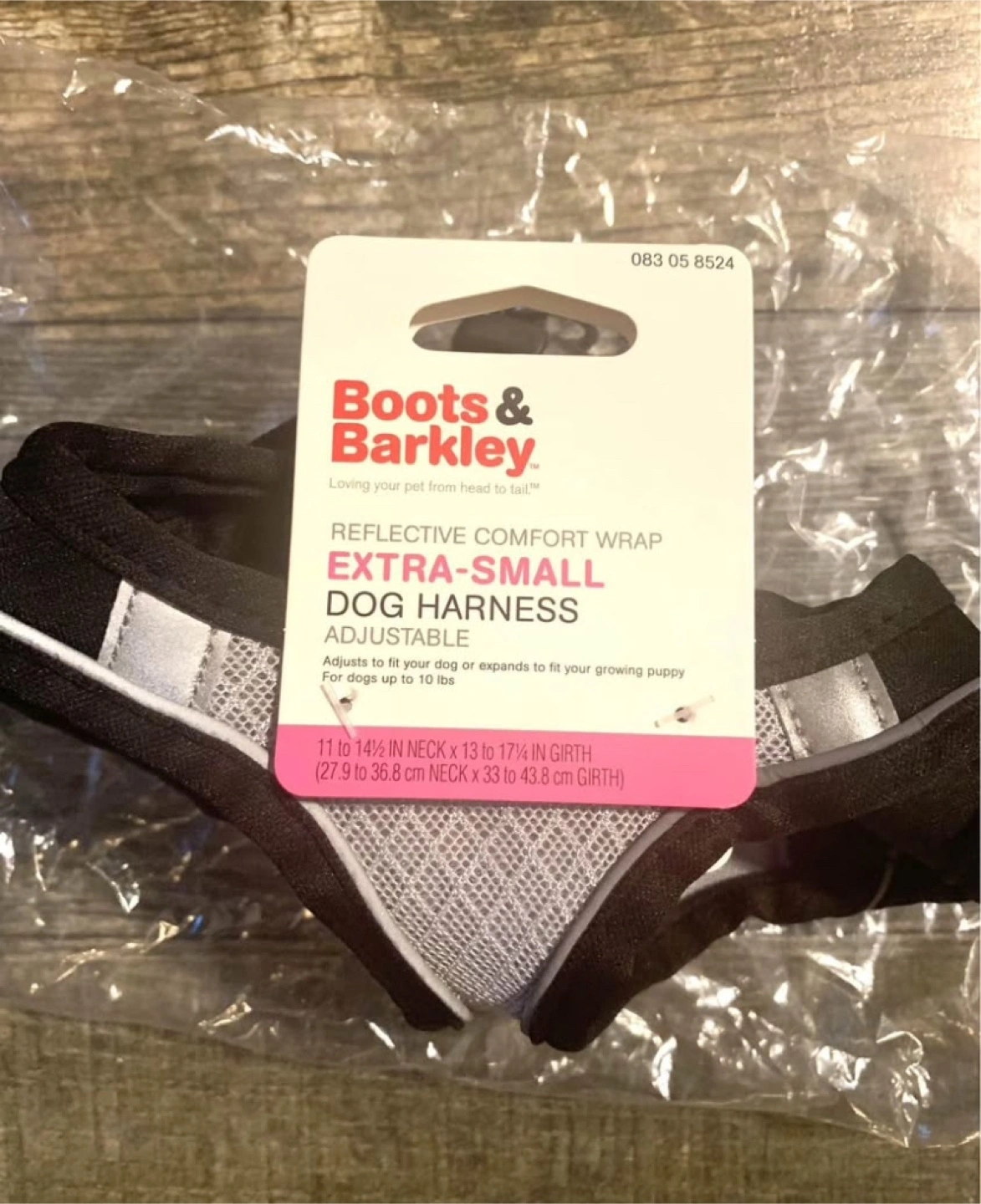 Reflective comfort wrap dog harness. Adjustable design. Buckle closure. Fits dogs up to 10 pounds. Nylon and polyester material. Spot or wipe clean. For small breeds.