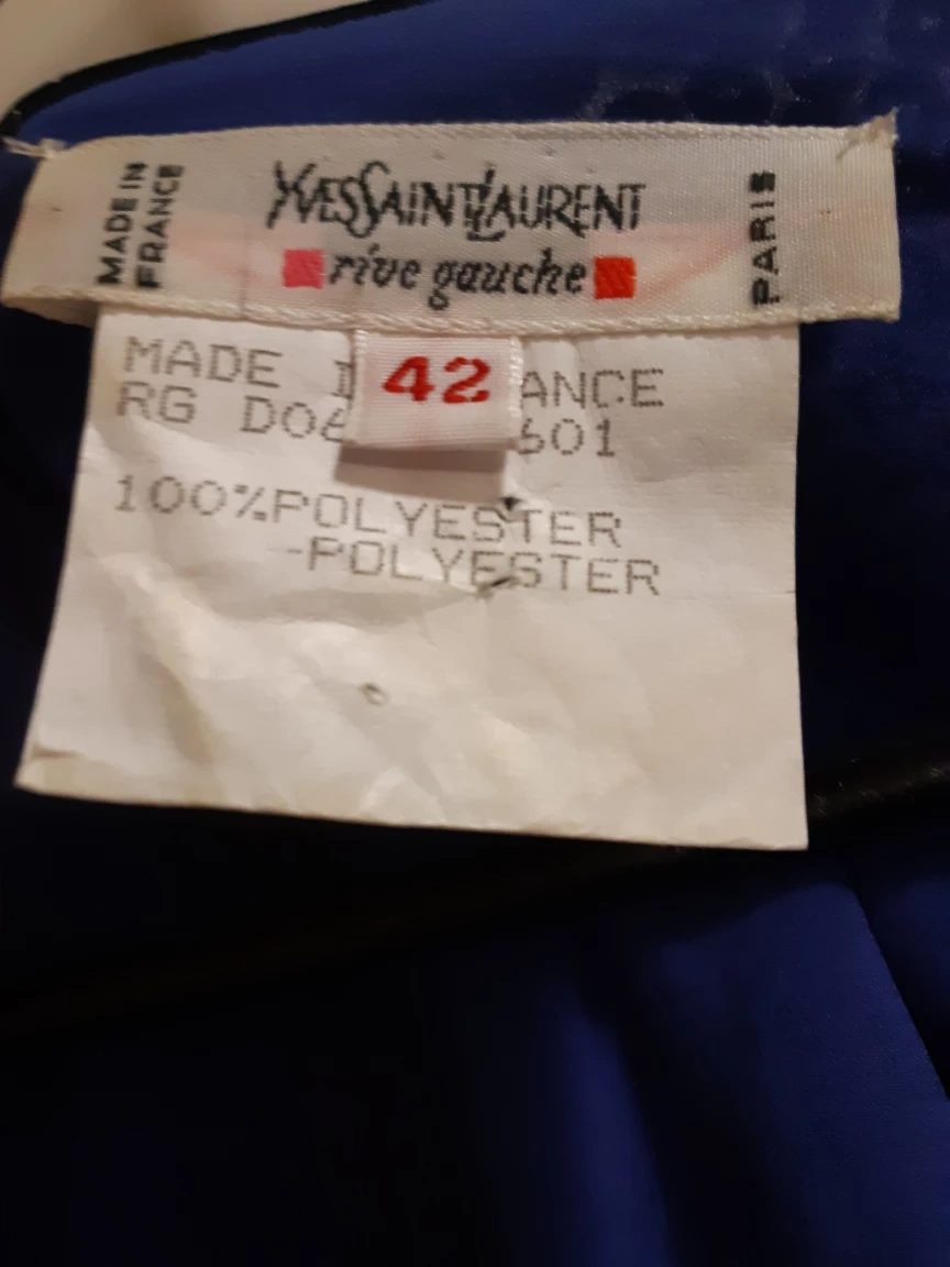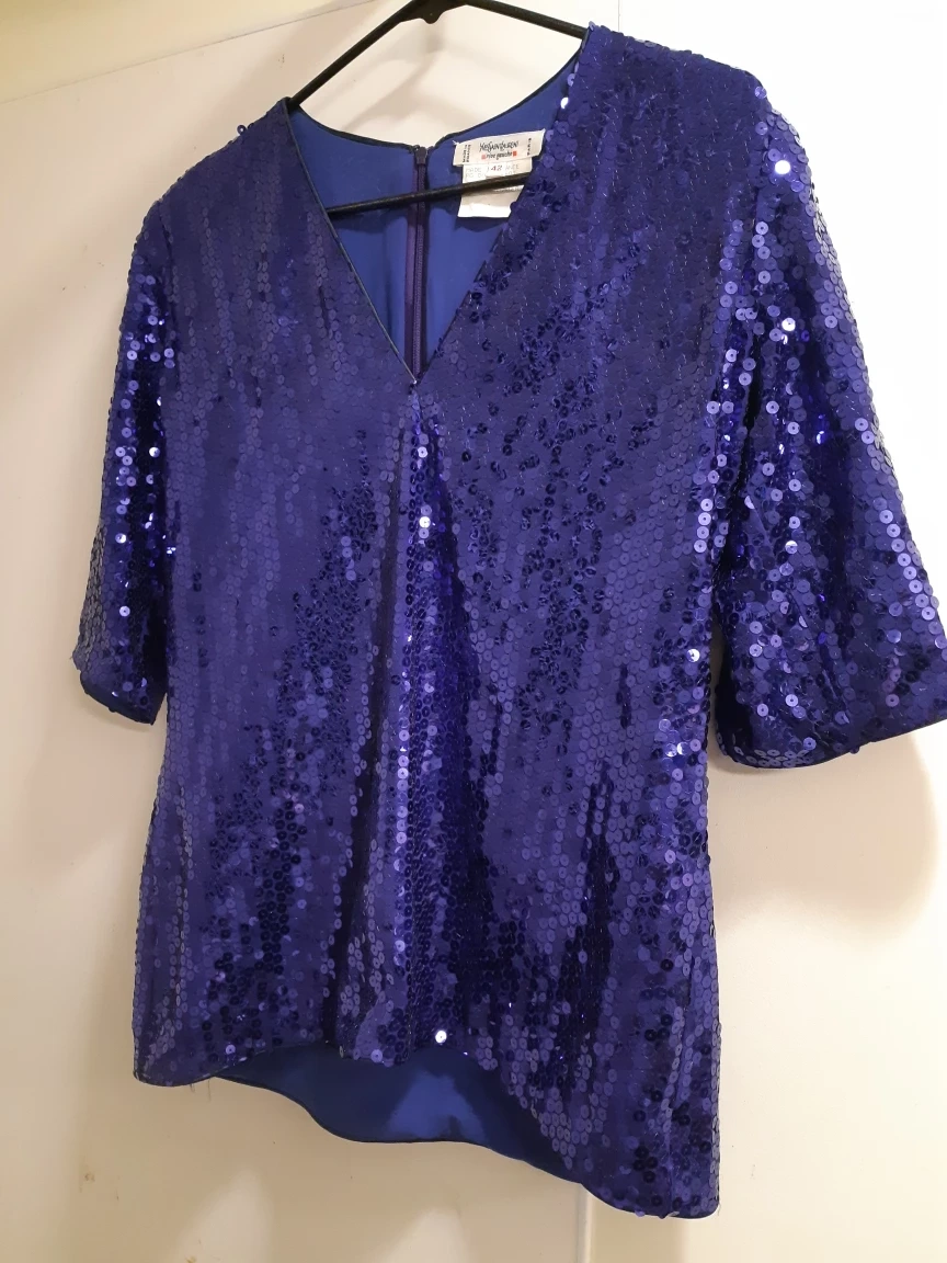 Vintage designer Yves St. Laurent blue sequined shirt (size 42) with shoulder padding and zipper on the back for sale for $350 o.b.o.! Good/like new condition, collectible and rare! 7786083054 call or text! Main St./Downtown pick-up is great!
