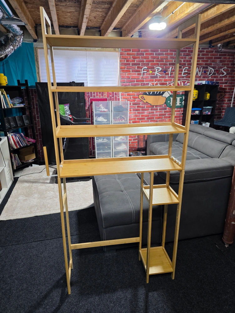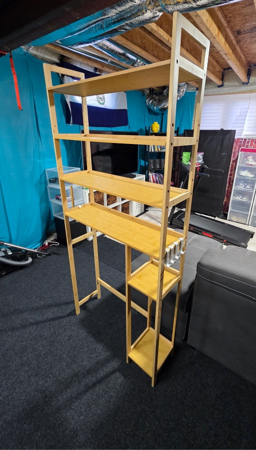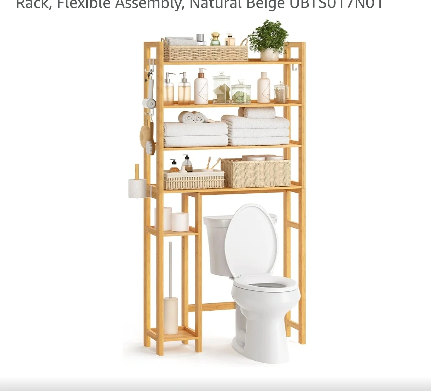 Bamboo bathroom storage rack. Five shelves, four hooks, and toilet paper holder. Fits over toilet. Natural beige colour.