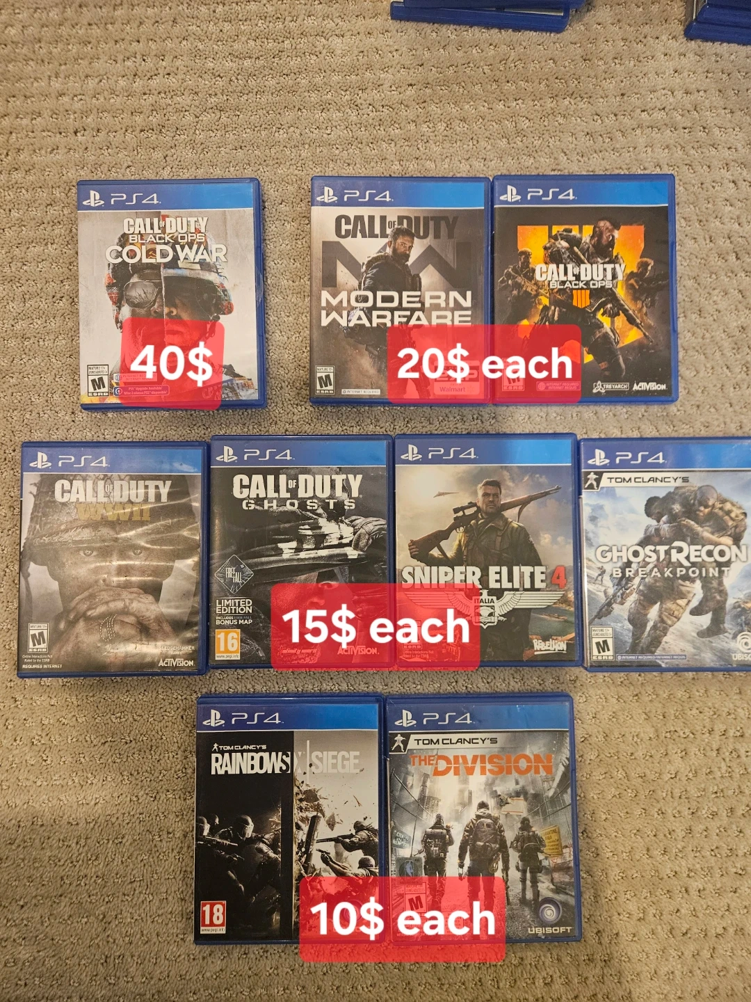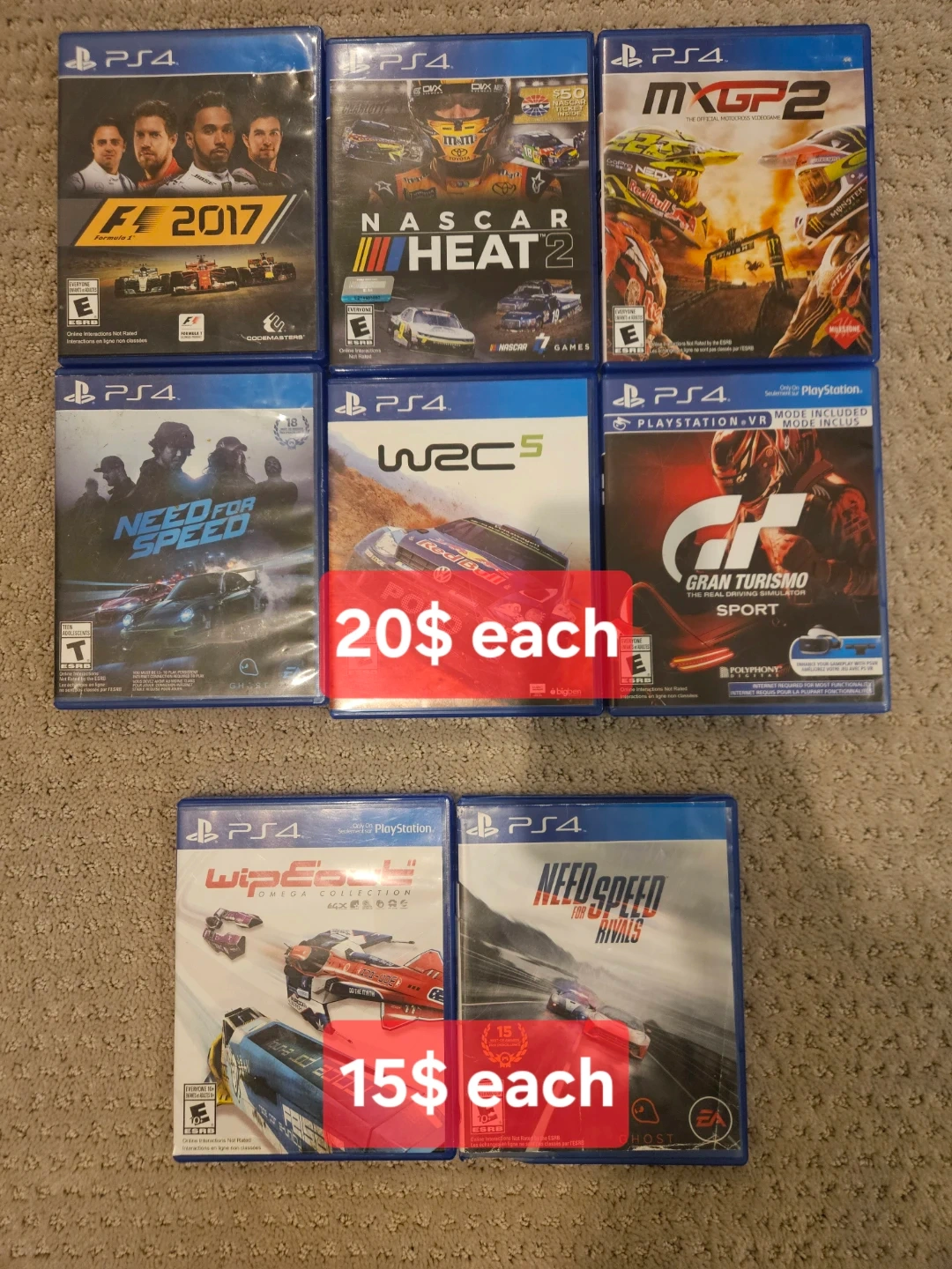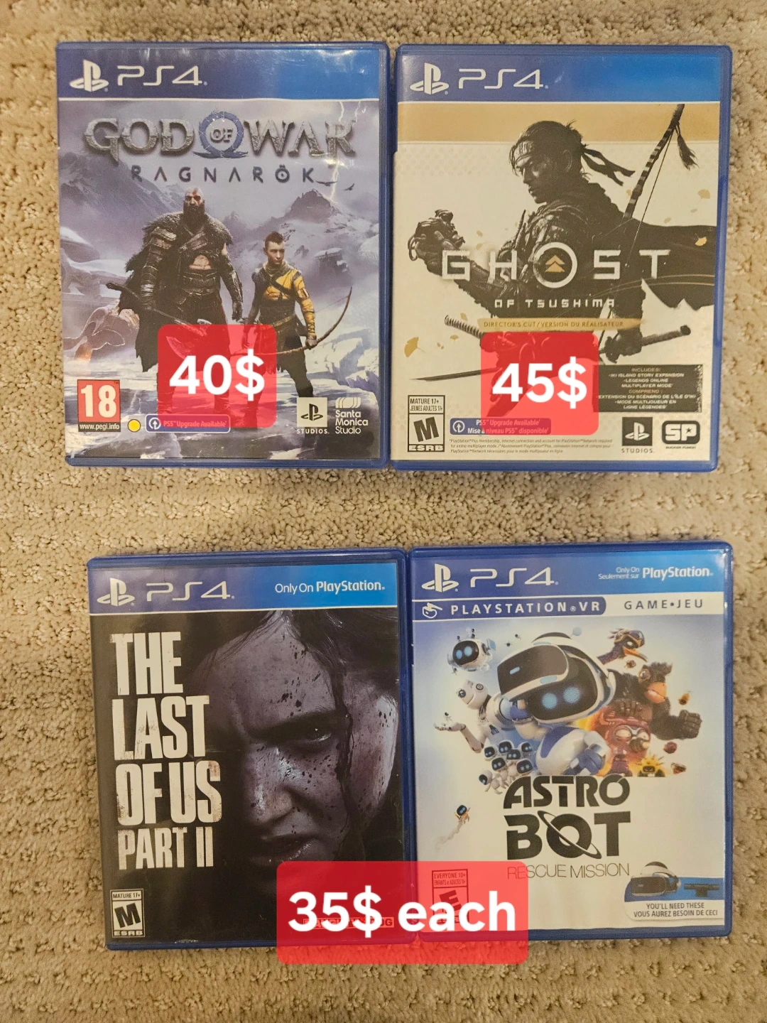 ๐Ÿ“€ Selling a large collection of 100+ PlayStation 4 games โ€” great condition, tested & ready to play! โญ All genres included: โœ”๏ธ Action / Adventure โœ”๏ธ Sports (FIFA, NBA, etc.) โœ”๏ธ Racing โœ”๏ธ RPG โœ”๏ธ Shooters โœ”๏ธ Family & Kids ๐Ÿ“Œ Highlights & Offer: โ€ข Special Offer: Buy 3 games and get one $10 game free! โ€ข Individual games available as well ๐Ÿ“Location: Panorama Hills NW