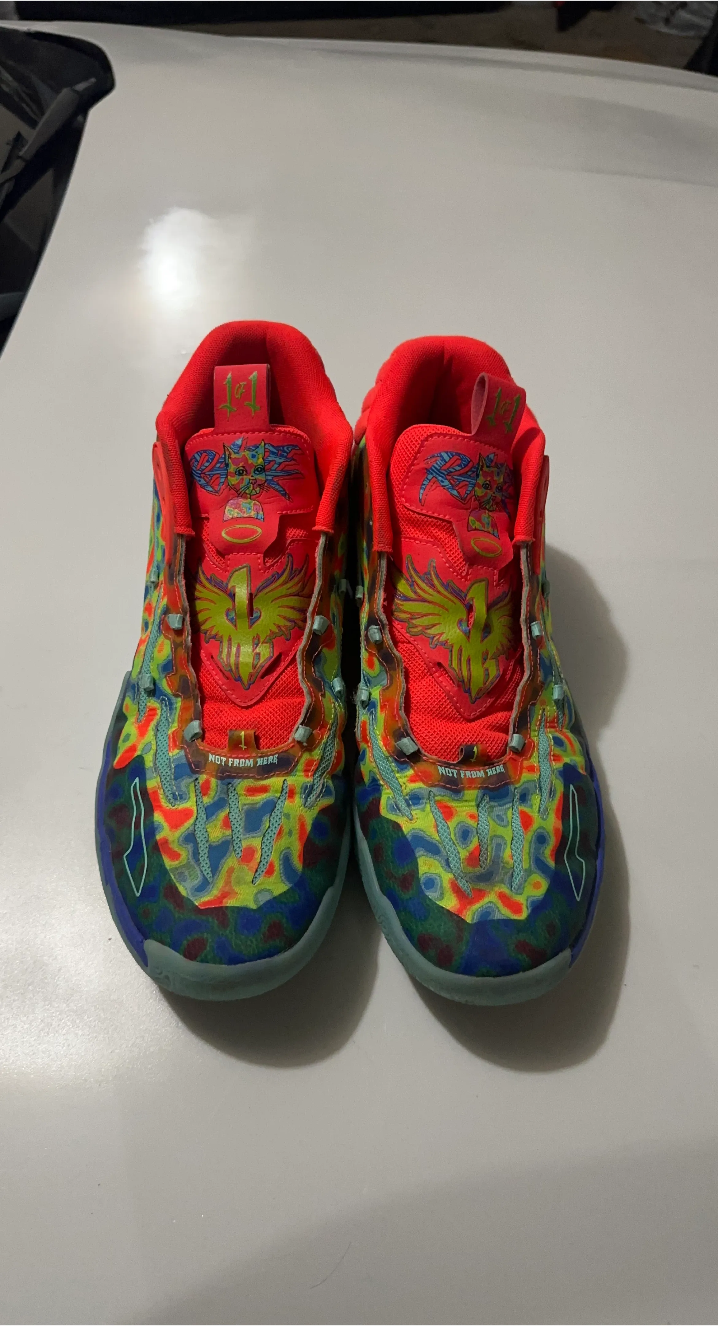 These vibrant sneakers feature a unique 'Not From Here' graphic design. They're primarily red with multicoloured accents. The design includes a cat with wings and a halo, along with a winged number 1. It's a bold and eye-catching pair for everyday wear.