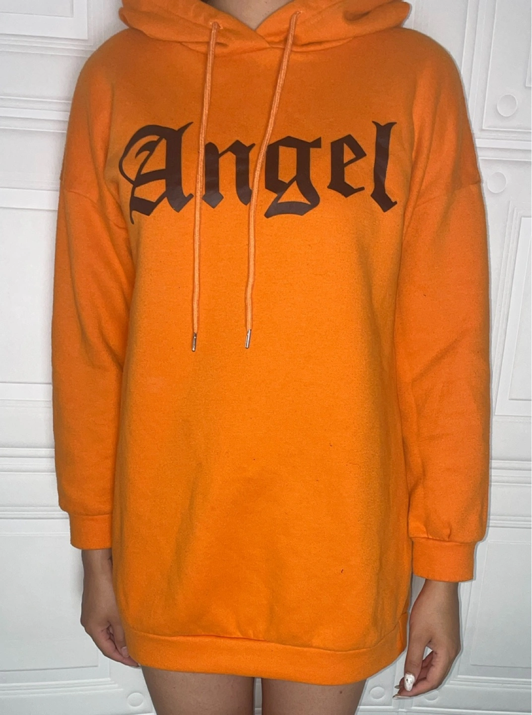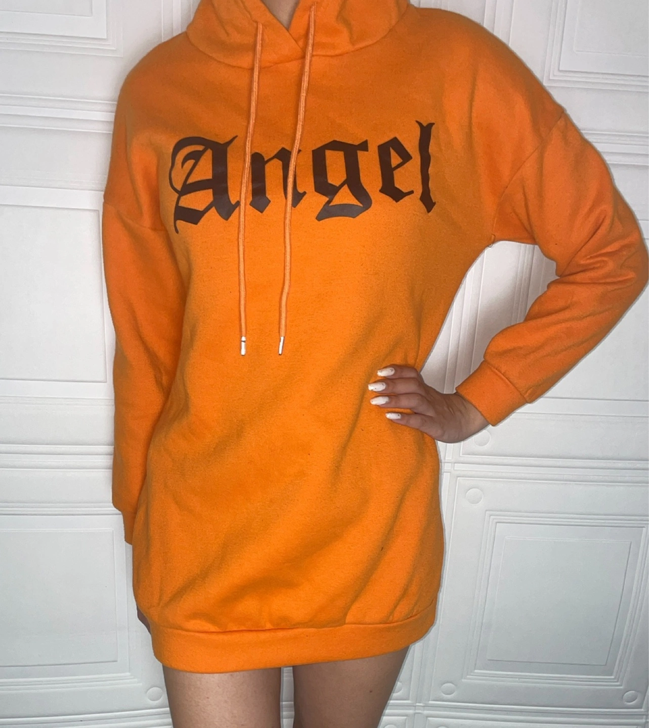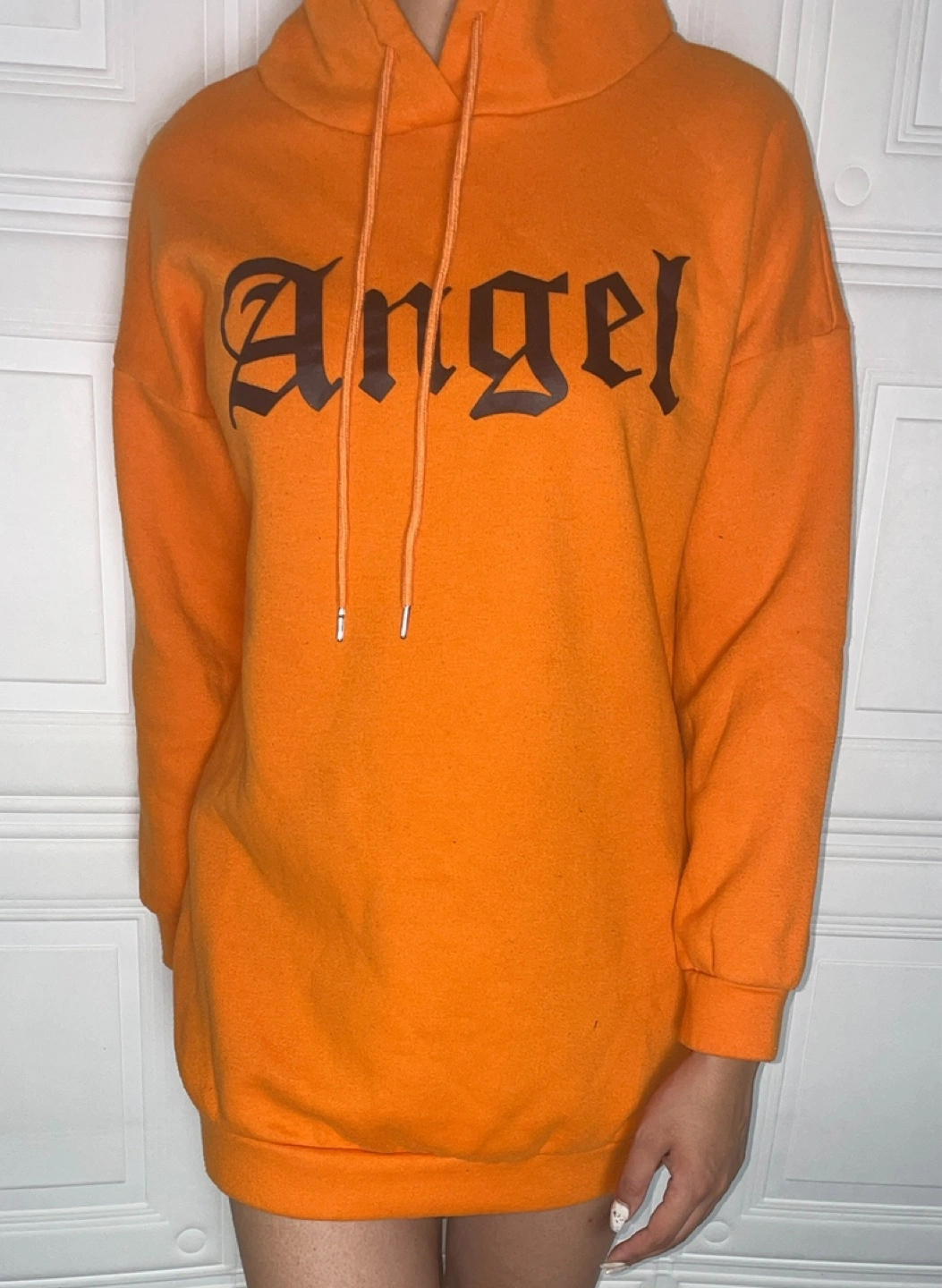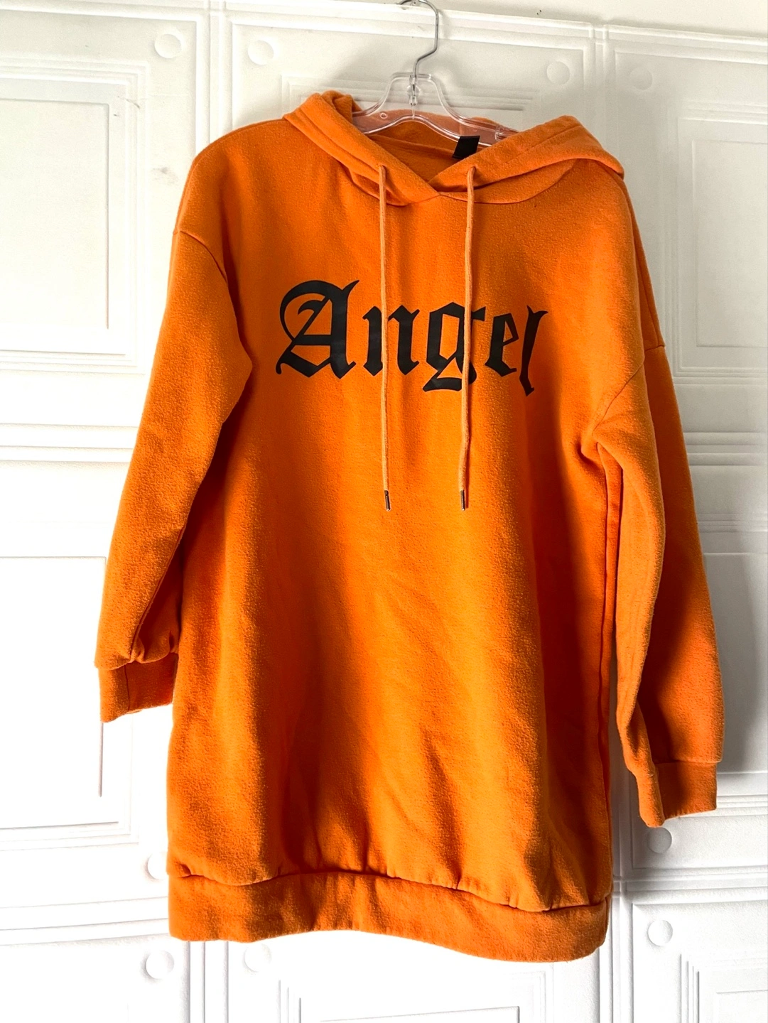 Bright orange hoodie dress. Features a dark brown "Angel" graphic on the front. Long sleeves and a drawstring hood. Relaxed fit.