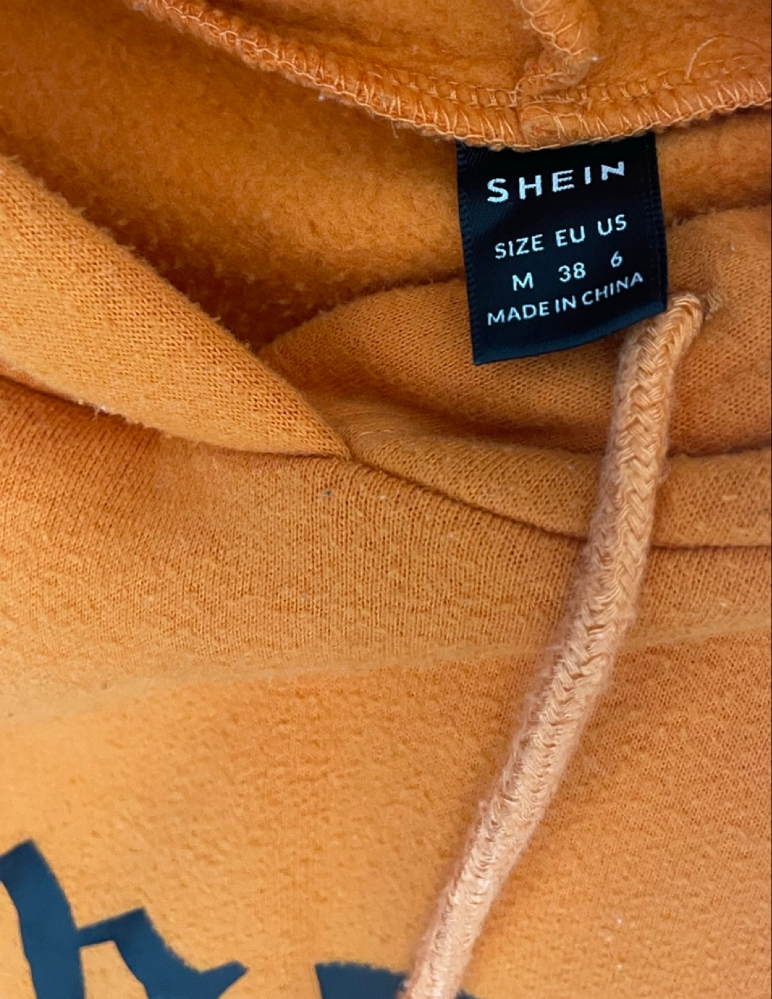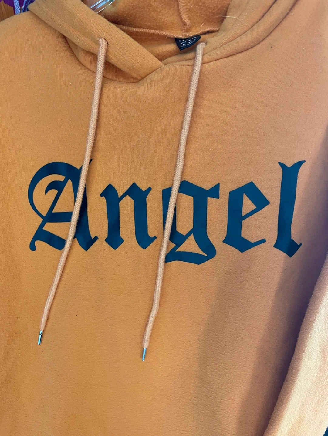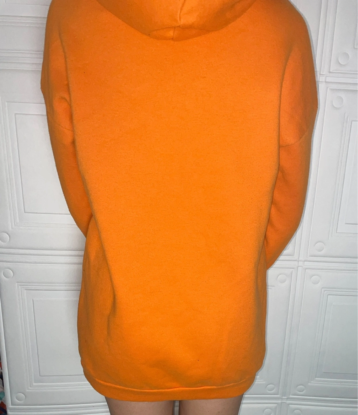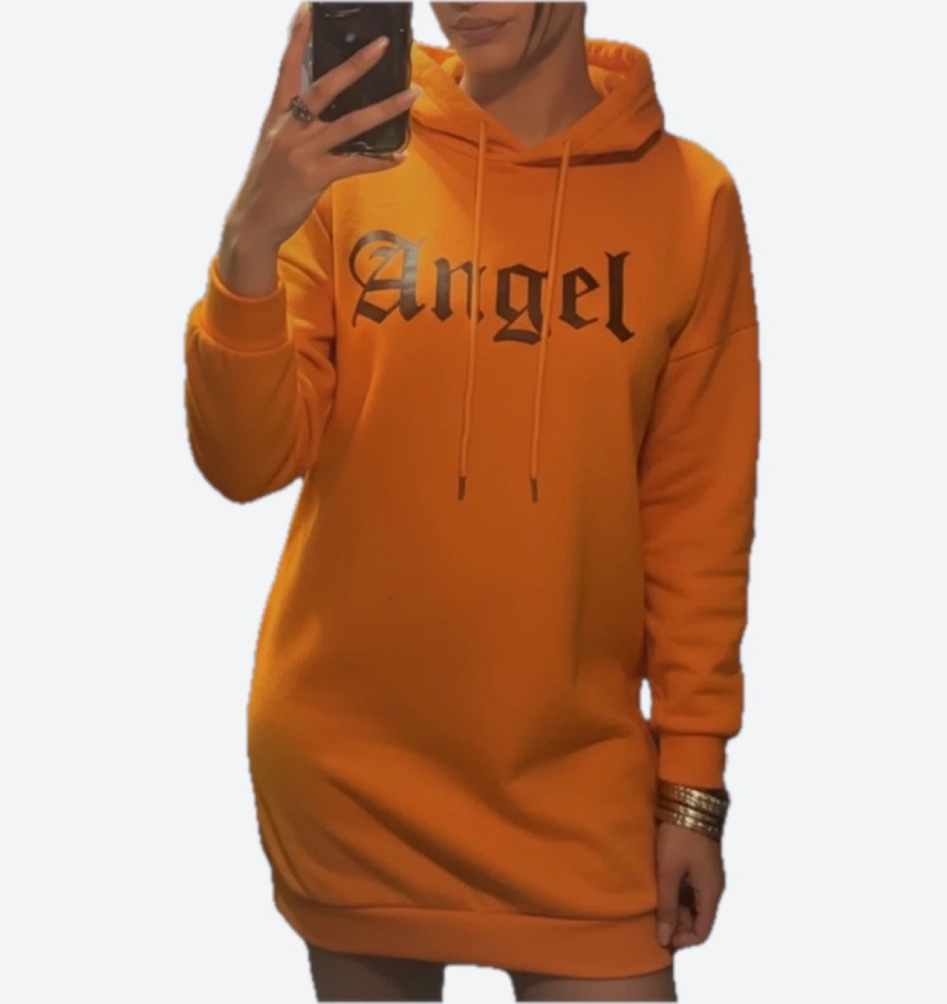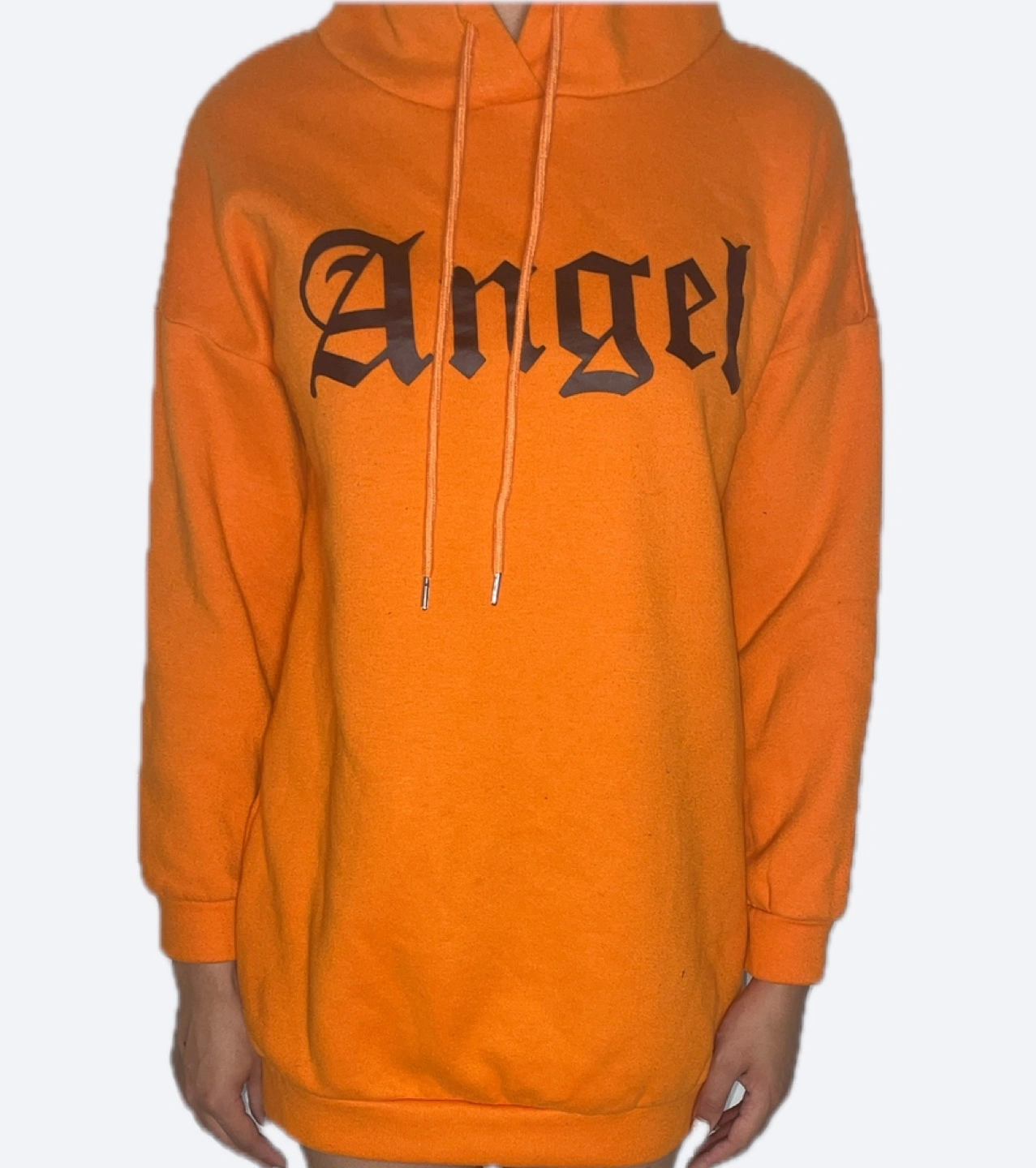 Bright orange hoodie dress. Features a dark brown "Angel" graphic on the front. Long sleeves and a drawstring hood. Relaxed fit.