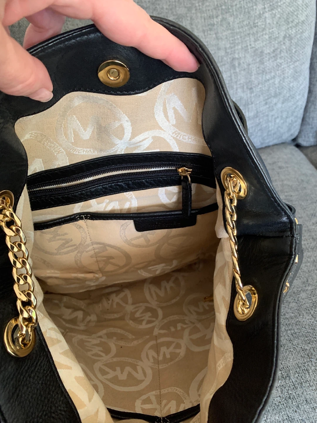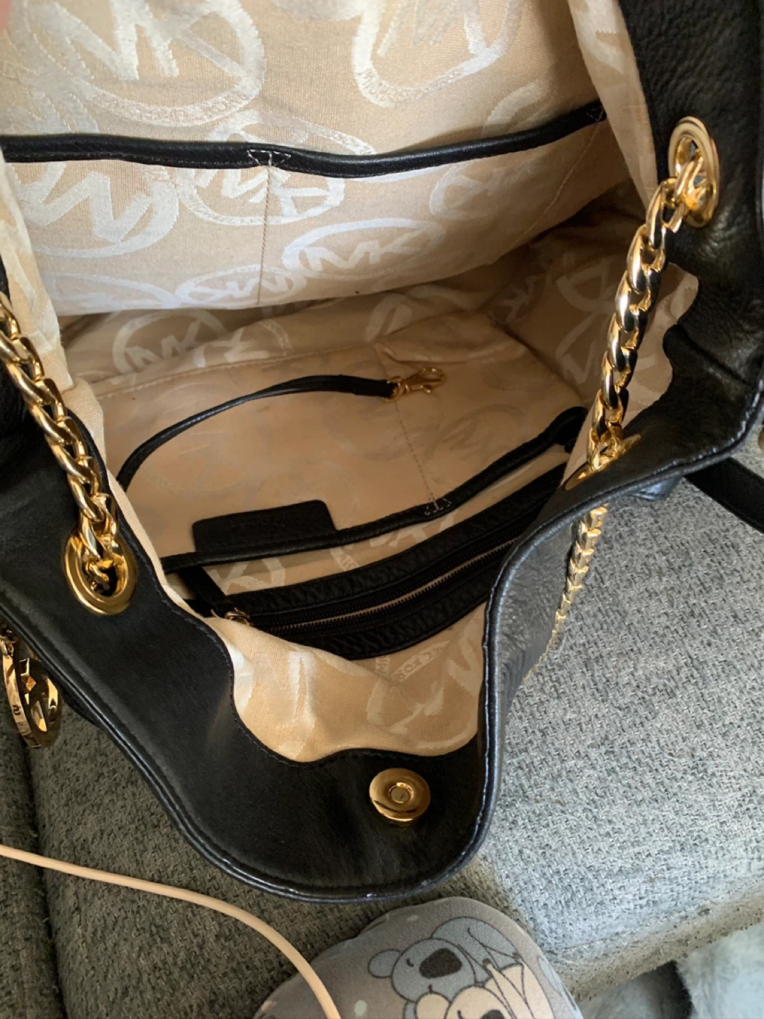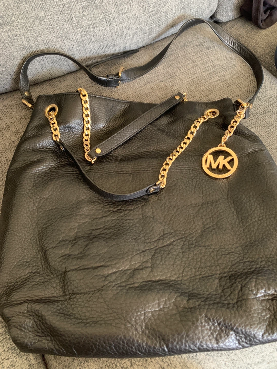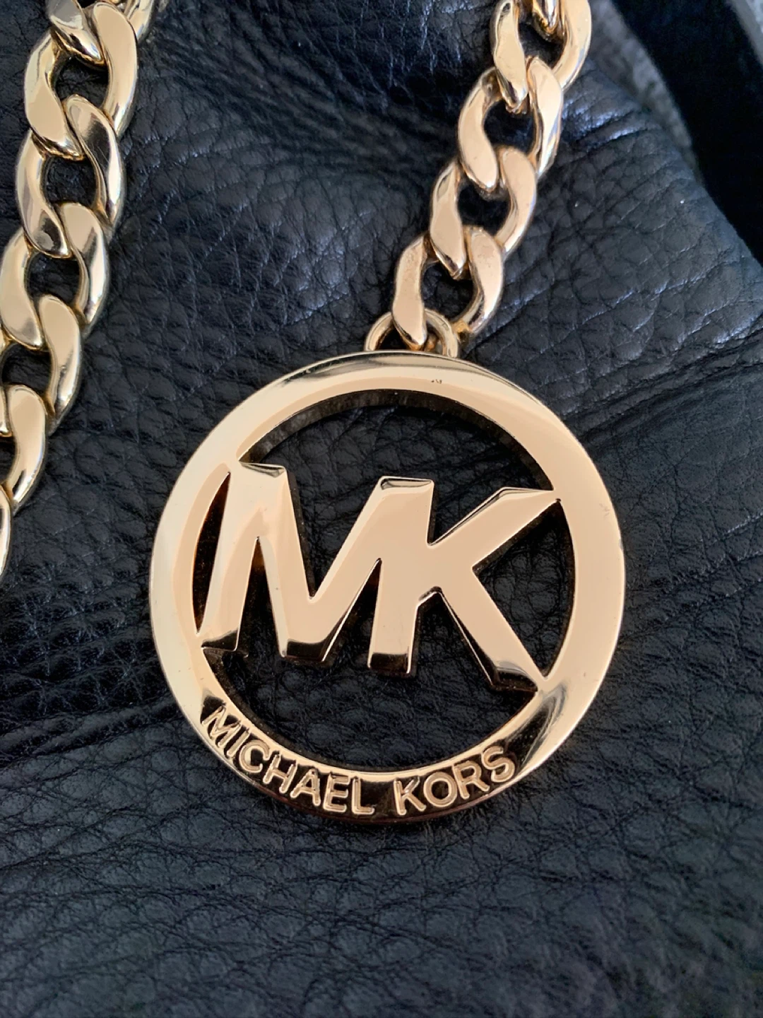 Selling a stylish Michael Kors shoulder bag in black leather! It features a gold chain detail and the iconic MK logo. The interior lining also has the MK logo subtly patterned throughout. It's in great condition and ready for a new owner!