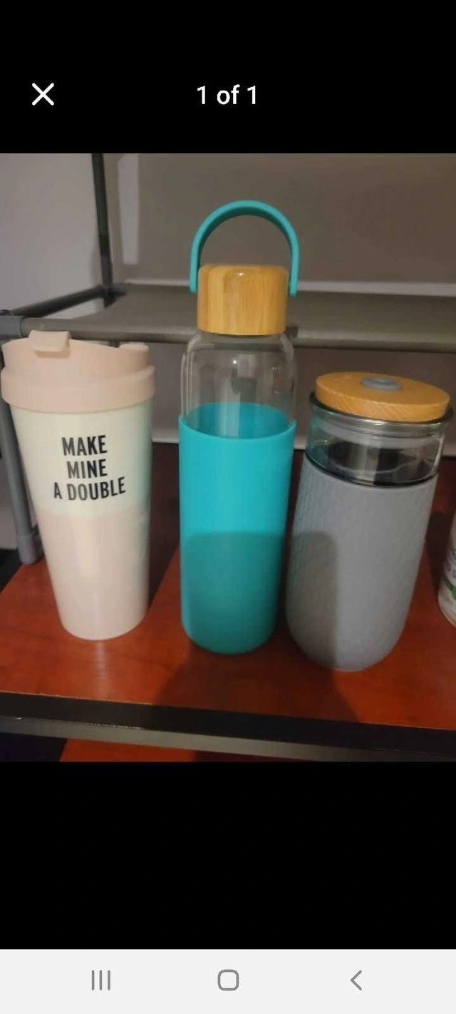 This set features three stylish reusable bottles, perfect for anyone looking to reduce their environmental footprint. Each bottle has its own unique design and is in good, but not new, condition. Ideal for water, smoothies, or any beverage on the go! * One bottle with "Make Mine A Double" printed on the side. * One glass bottle with a teal silicone sleeve and bamboo lid. (straw was lost) * One grey bottle with a wood-look top and grey silicone sleeve. Pick up near 344 Bathurst Street or 1115 Dufferin Street. Cash accepted.