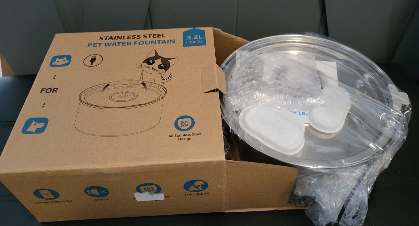 Stainless steel pet water fountain with a 3.2L capacity. It features an all stainless steel design and includes several filter refills. The 5V pump ensures quiet operation. It's vet approved and suitable for cats and dogs.