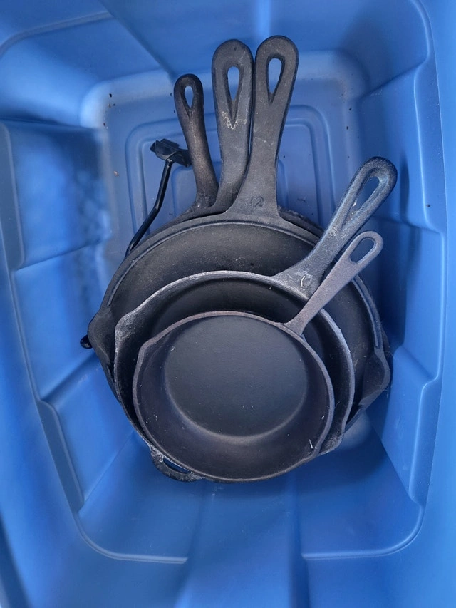 Selling five cast iron pans. One is in so-so condition, the rest are great. Asking $75 for all. Cash accepted. Curbside pick up available.