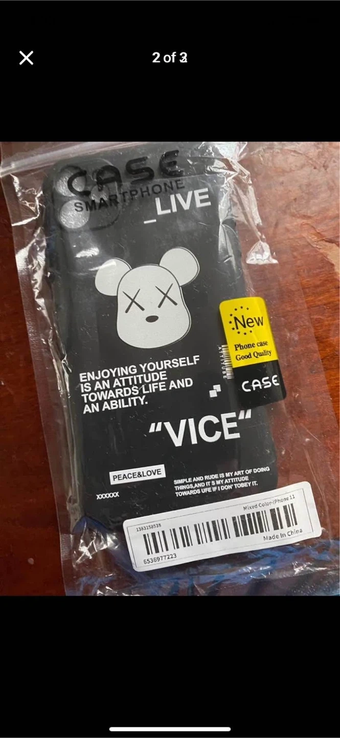 This is a black phone case for an iPhone 11. It's made by CASE SMARTPHONE LIVE and features "VICE" text and a graphic design. The case is in mixed colour and was made in China.