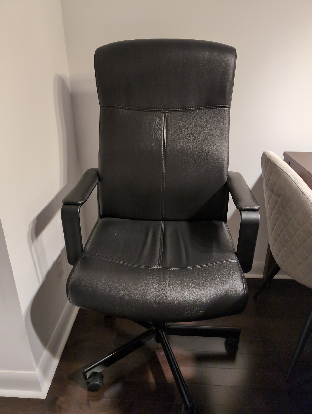 Selling a comfy black leather office chair! It has a high back for good support and adjustable height. Perfect for long work days!