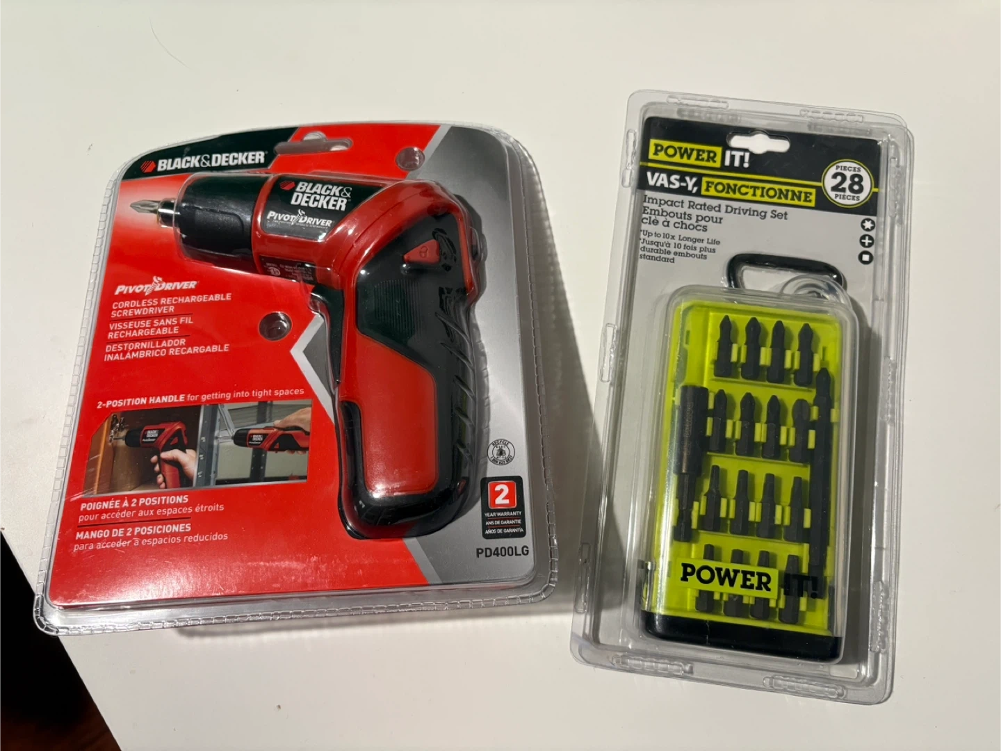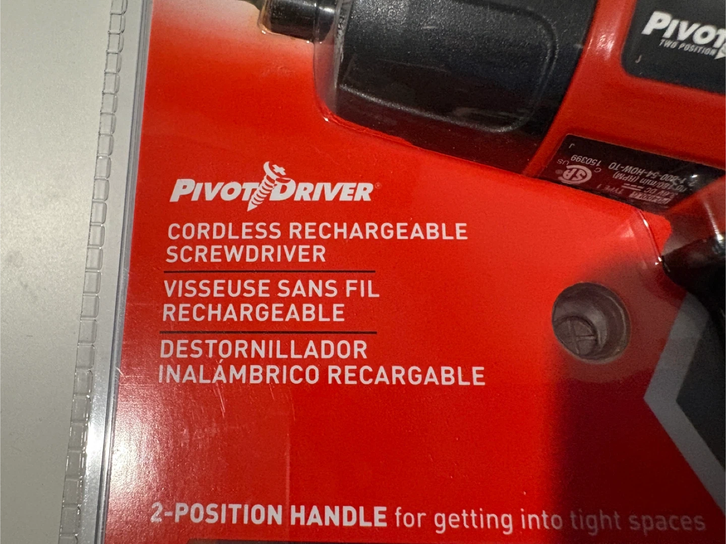 Selling a Pivot Driver cordless rechargeable screwdriver. It features a 2-position handle designed to get into tight spaces. Also included is a Power It! impact rated driving set with 28 pieces