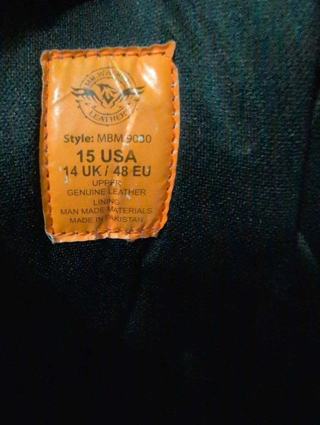 Check out these rugged Milwaukee Leather work boots, perfect for any tough job! These size 14 boots are made with genuine leather and are in used condition. They are great for construction, outdoor adventures, or just adding a bit of edge to your everyday look. Ready to step into durability? Brand: Milwaukee Leather, Style: MBM 9030, Size: 14 USA / 14 UK / 48 EU, Upper: Genuine Leather, Lining: Man-made materials, Made in Pakistan. I am pricing these boots at $40. If the ad's still up, the boots are still available. Happy trails (or worksites)!