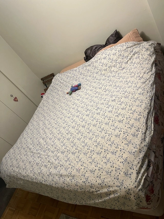 Moving sale! King size bed, everything included: mattress, box spring, easy to move bed frame. Sheets, mattress cover and queen size duvet can be included if desired