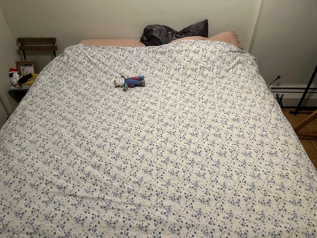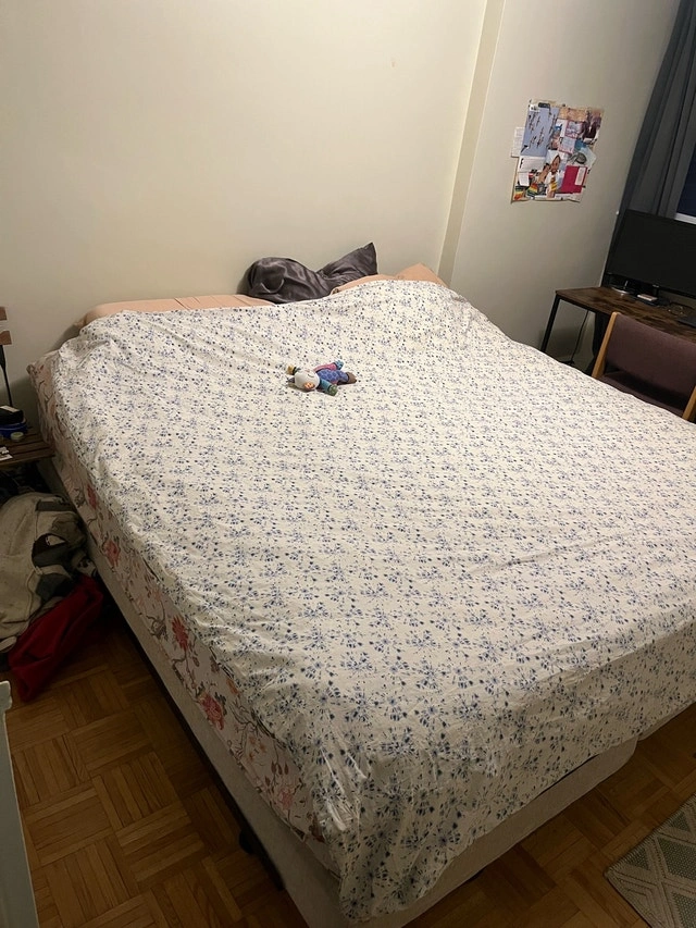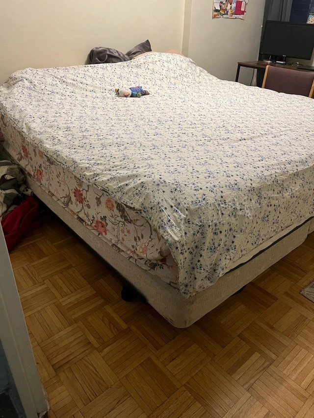 Moving sale! King size bed, everything included: mattress, box spring, easy to move bed frame. Sheets, mattress cover and queen size duvet can be included if desired