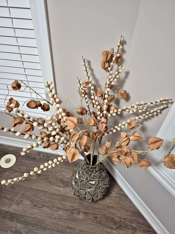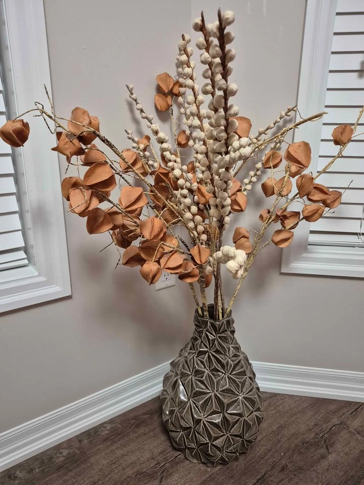 A beautiful, contemporary tabletop sculpture featuring delicate metal wire flowers and stems. The circular black "cage" base is accented with polished silver-tone details, making it a great statement piece for a modern home. It’s an elegant, maintenance-free alternative to real flowers. Condition: Like new, very well-maintained. Style: Modern / Contemporary / Industrial. Location: Milton (near Scott/Derry)