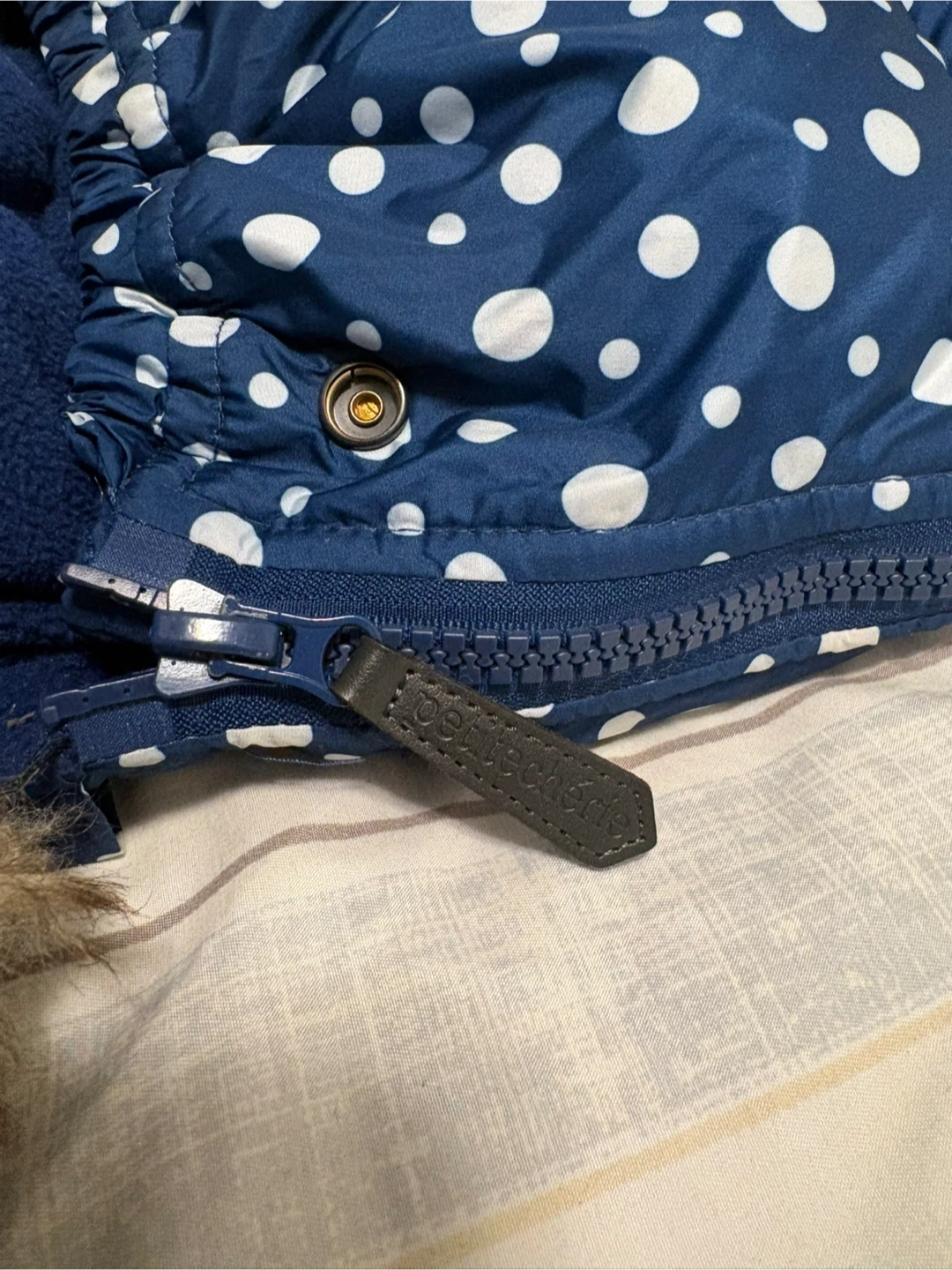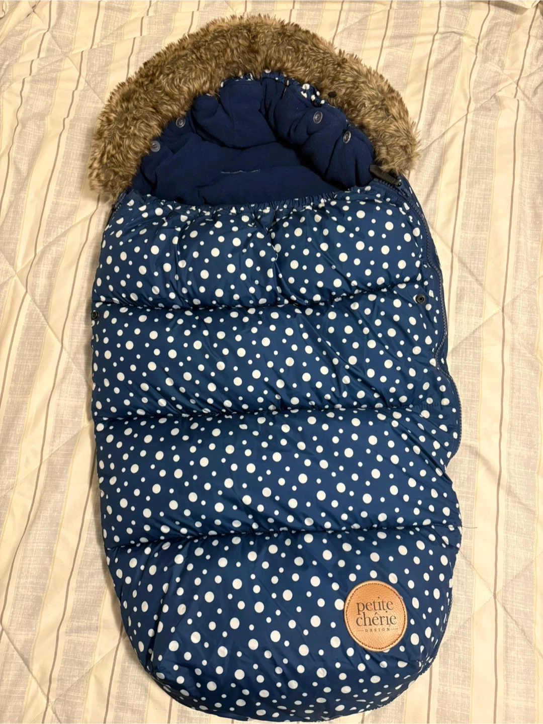 Stay warm this winter with this adorable navy polka dot bunting bag from Petite Chérie. It features a cozy fleece lining and a faux fur-trimmed hood. Designed for stroller or car seat use with built-in harness openings.