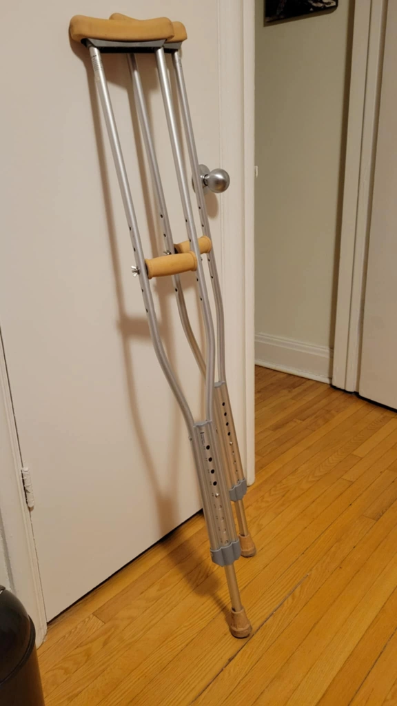 Aluminum crutches with adjustable height. Tan hand grips. Good used condition.