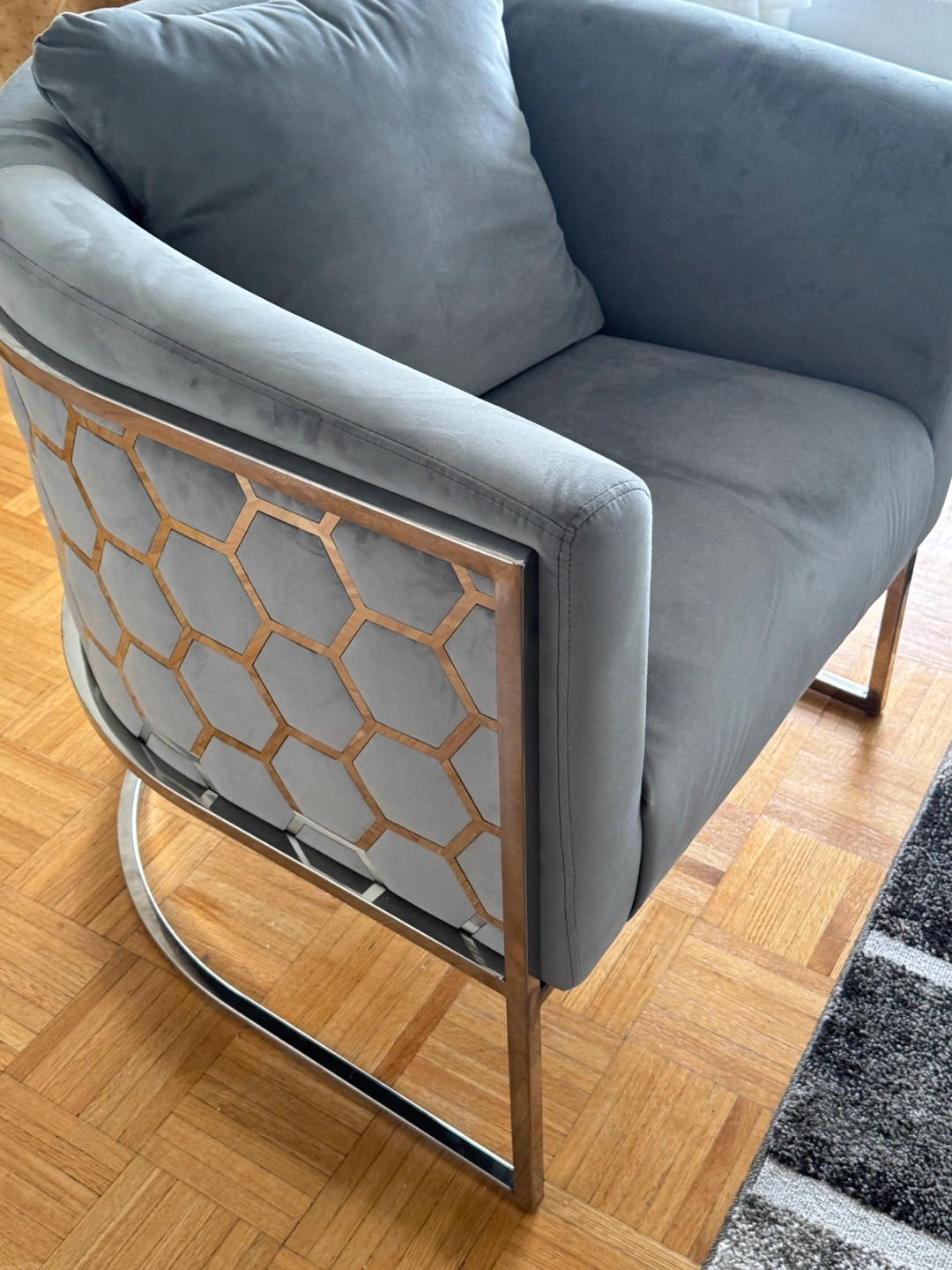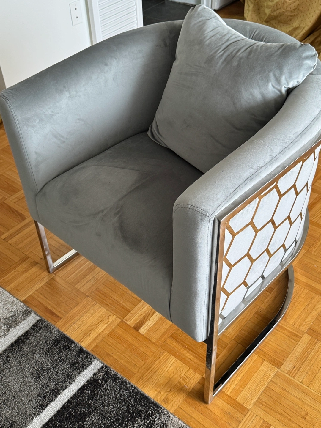 Stylish accent chair. Grey velvet upholstery. silver metal frame. Curved design. Comfortable seating. Includes a cushion.