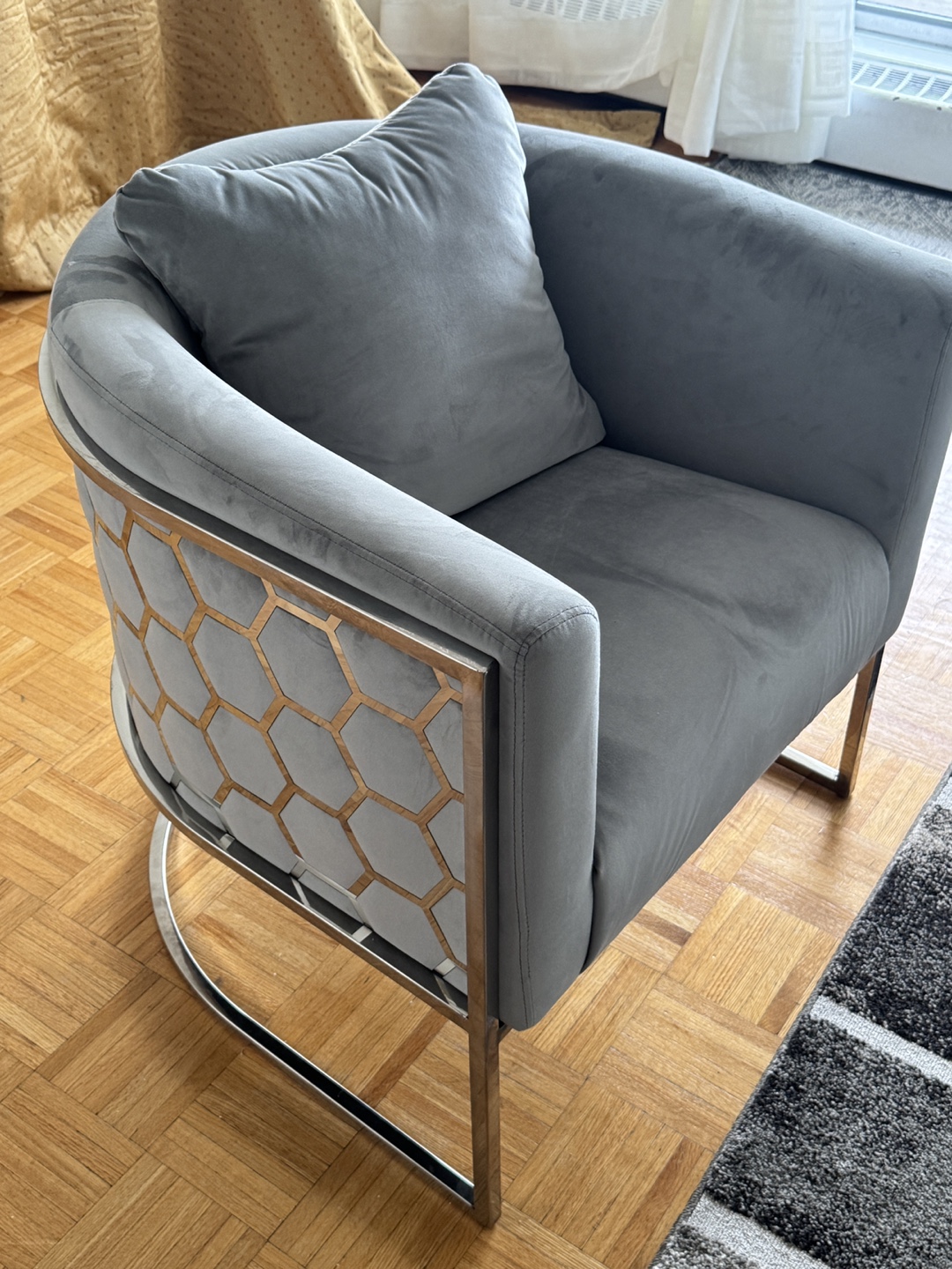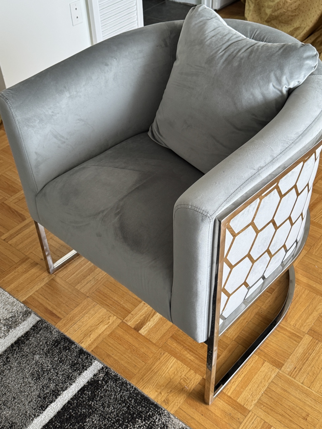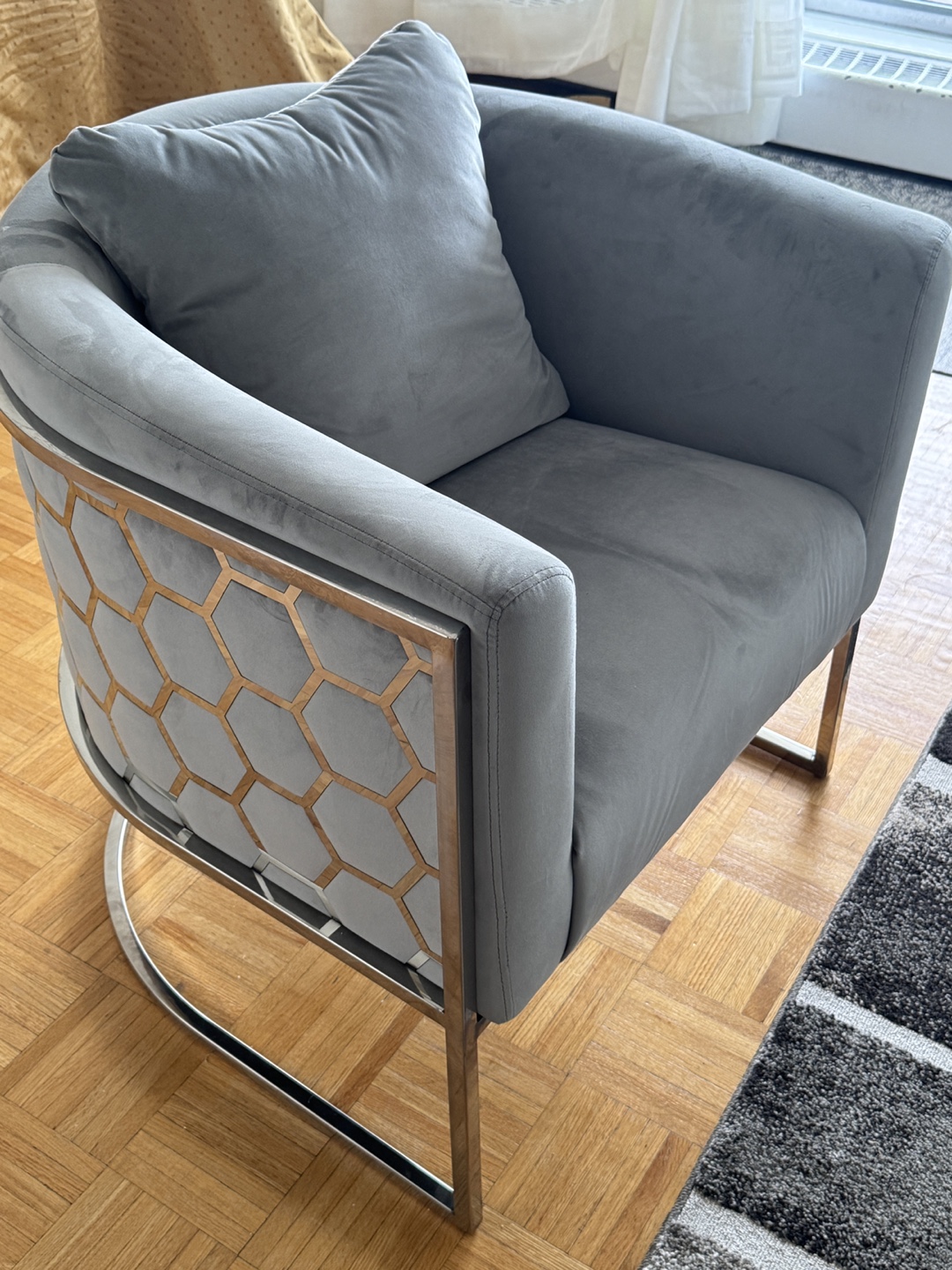 Stylish accent chair. Grey velvet upholstery. silver metal frame. Curved design. Comfortable seating. Includes a cushion.
