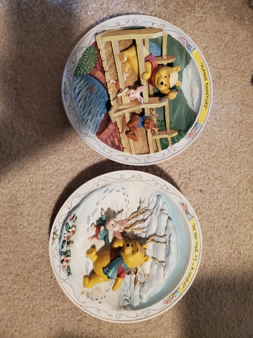 Two collectible Winnie the Pooh 3D decorative plates. Each plate has a unique quote and detailed sculpted characters from Bradford exchange