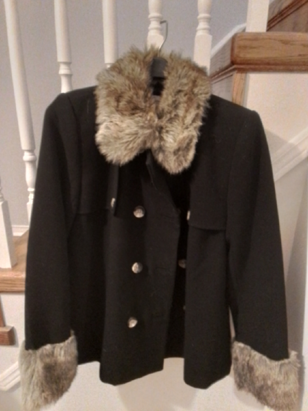Selling a stylish black jacket featuring faux fur trim on the collar and cuffs. It's in great condition and ready to add a touch of elegance to your wardrobe!
