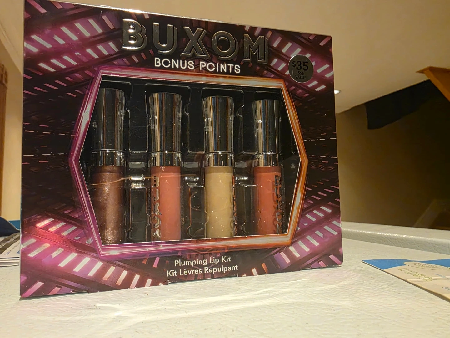 This is a Buxom Bonus Points Plumping Lip Kit. It includes four mini lip glosses in various shades. These lip glosses are known for their plumping effect.