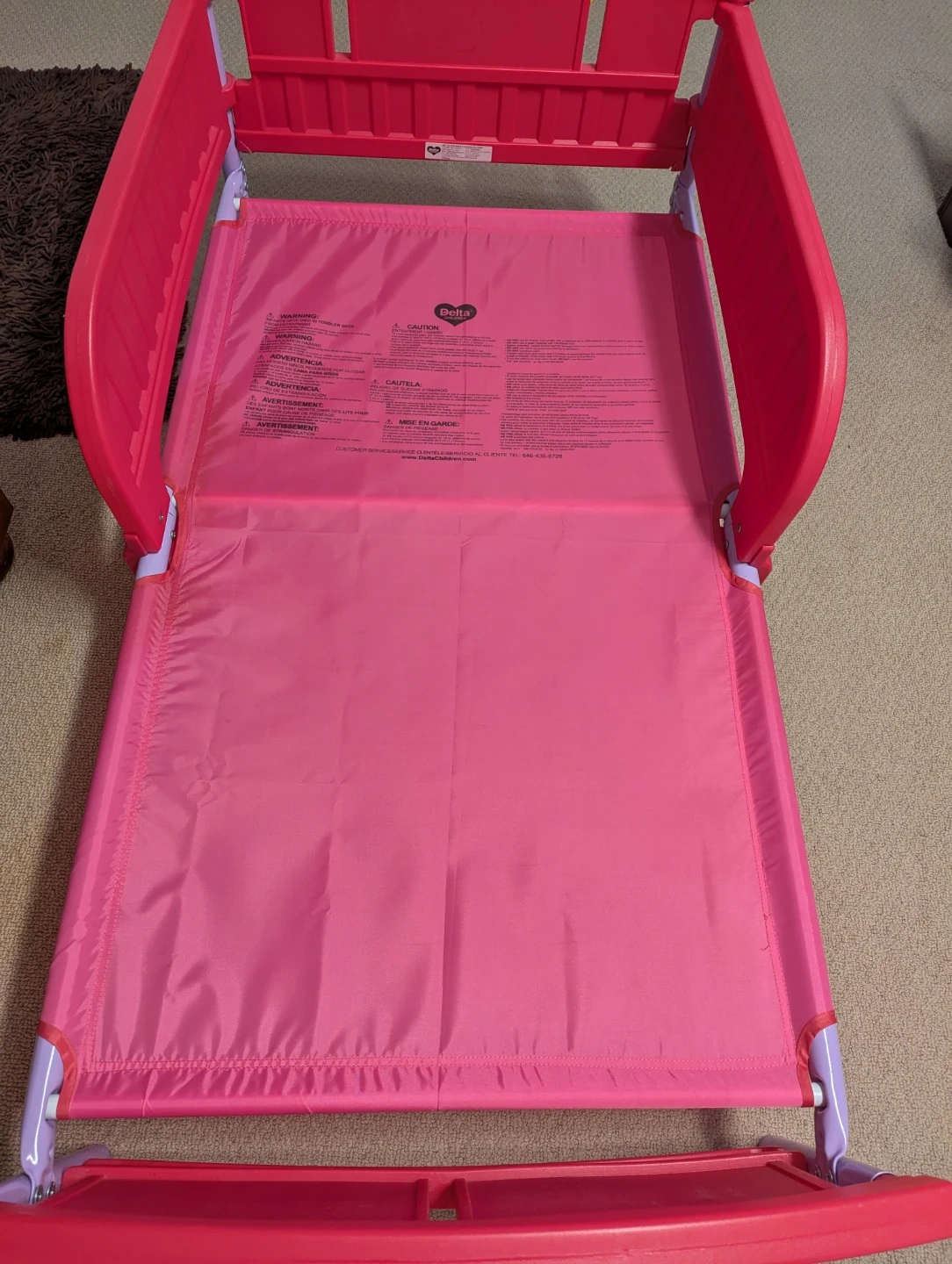 This is a pink Disney Minnie Mouse toddler bed featuring Minnie and Daisy. It has safety rails on the sides. The bed frame is made of plastic.