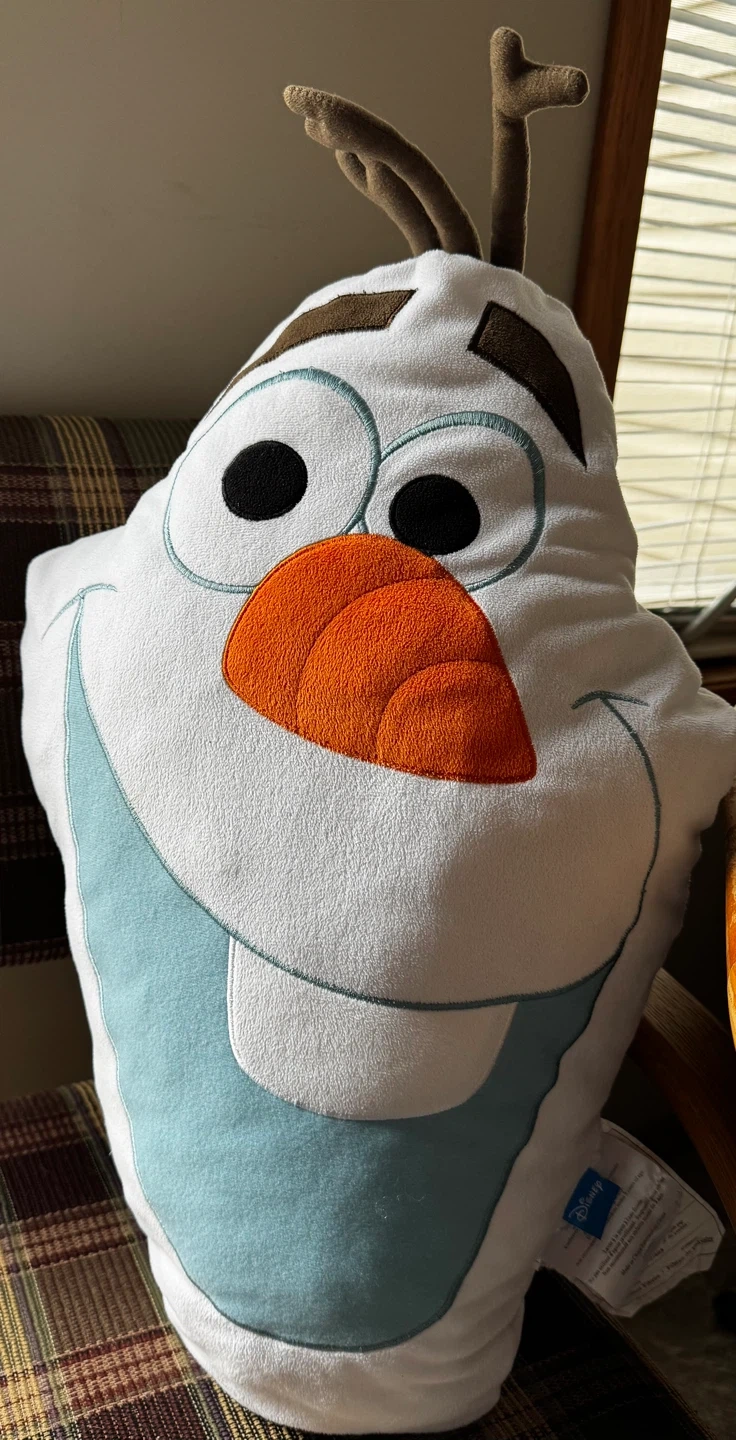 Selling a cute Olaf plush pillow from Disney! It's in great condition and would be perfect for any Frozen fan. The pillow is soft and cuddly & has a pocket in the back, making it a great addition to any room