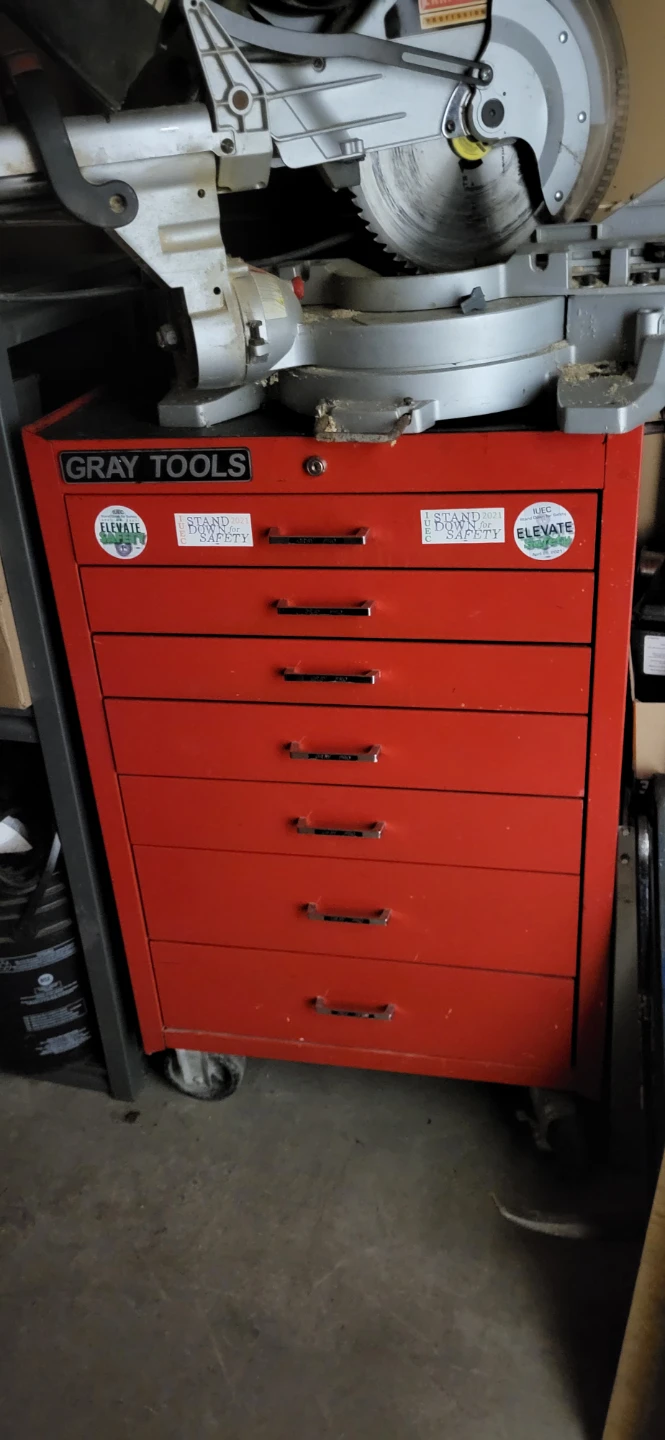 Selling a red tool cabinet from Gray Tools! It has 5 drawers for organizing all your tools. It's on wheels, so it's easy to move around your workspace
