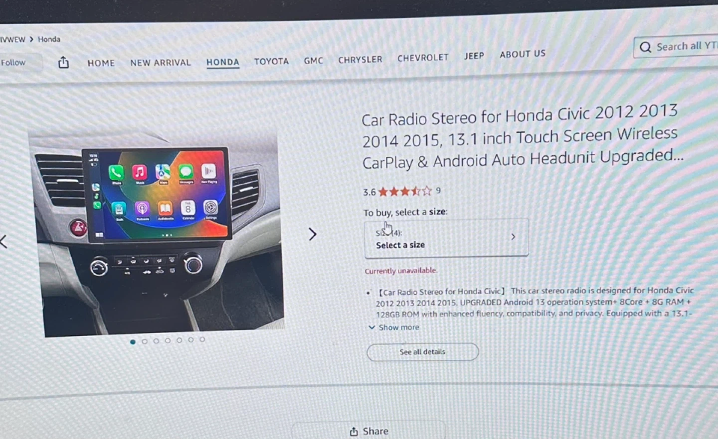 YTPIVWEW car radio stereo designed for Honda Civic 2012, 2013, 2014, and 2015 models. It features a 13.1-inch touch screen with upgraded Android Auto and CarPlay. Upgraded Android 11 operation system.