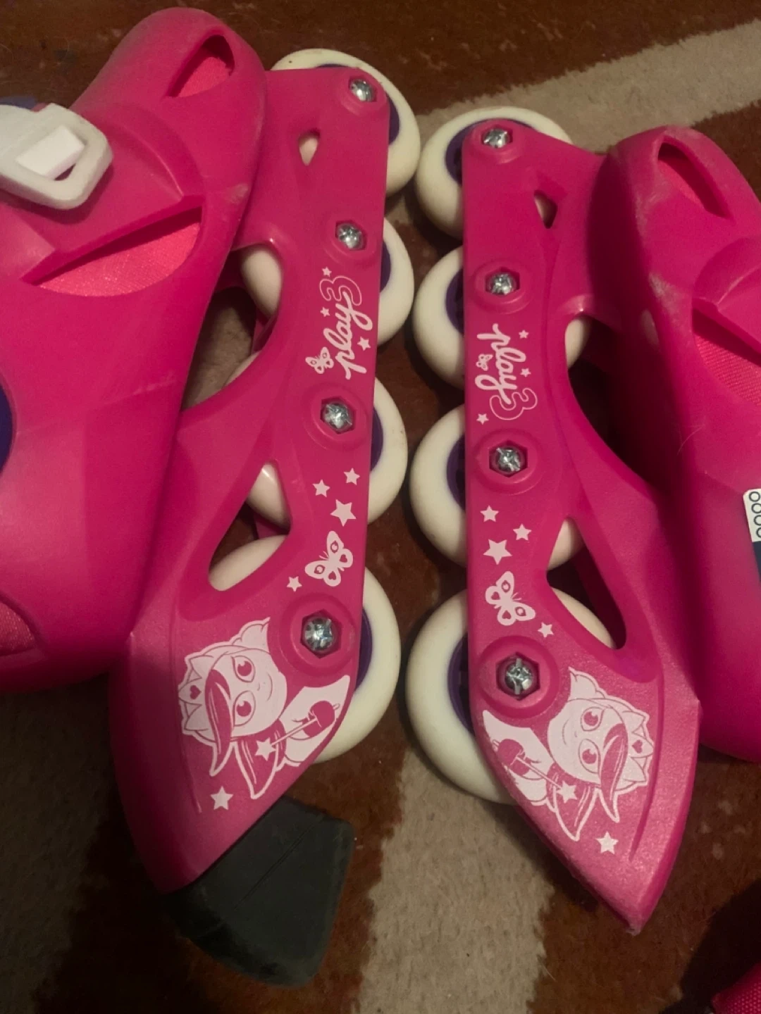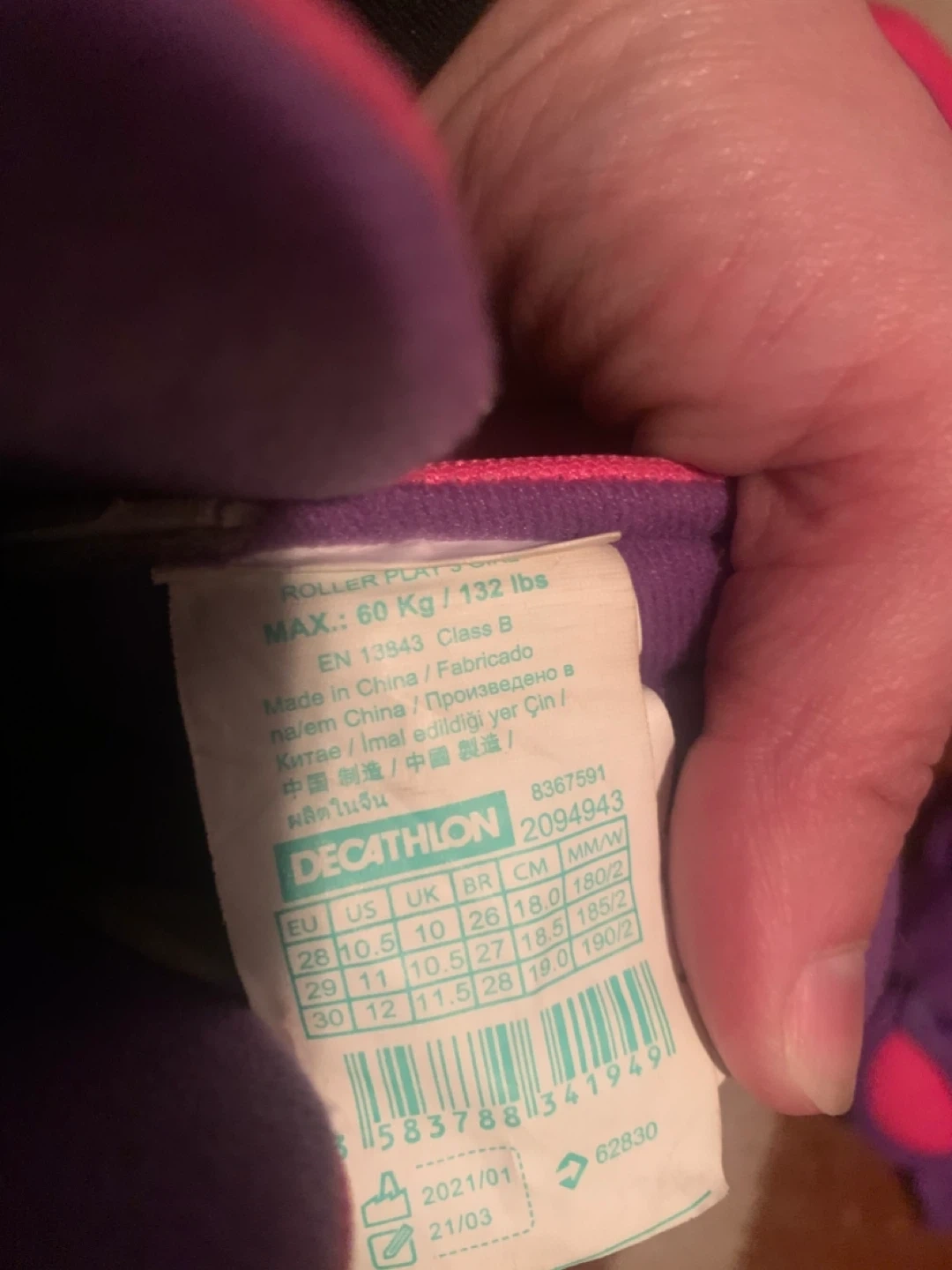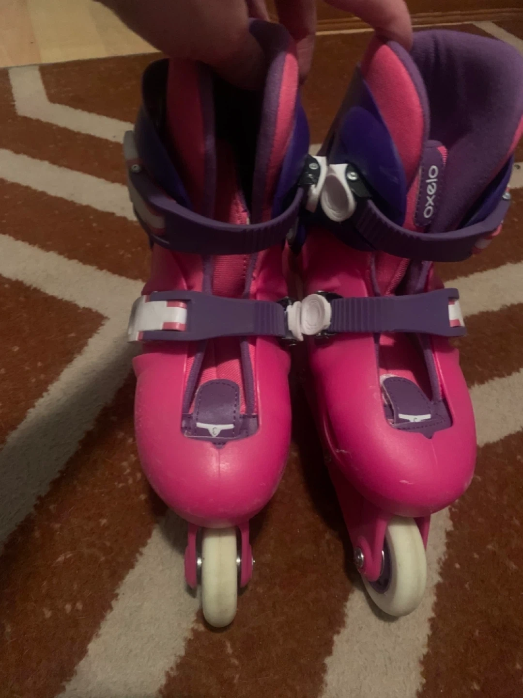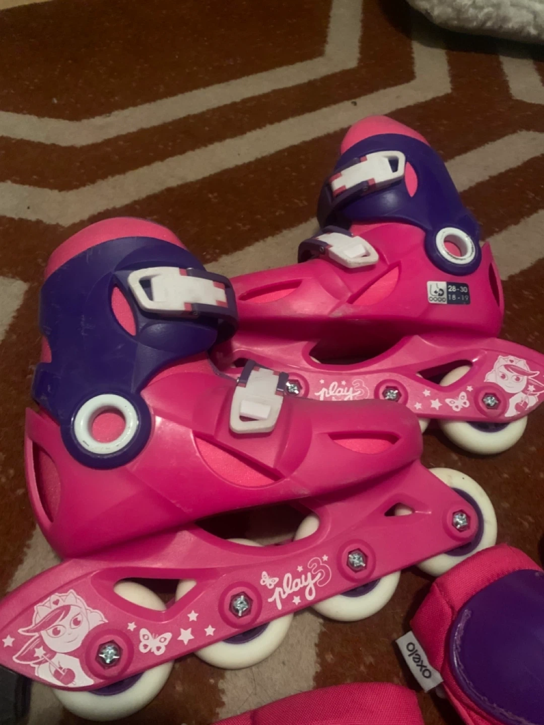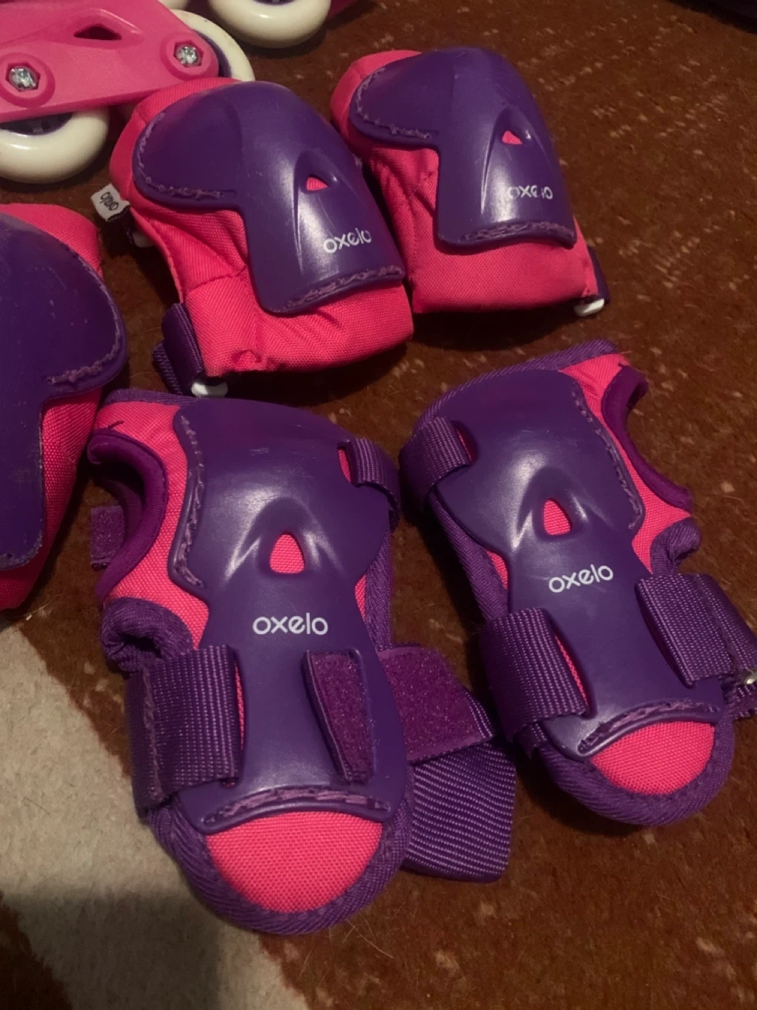 This set includes pink and purple Oxelo roller skates with adjustable sizing, suitable for children. It also comes with matching purple and pink protective gear for knees and elbows and hands. These skates are designed for beginner rollerblading adventures!