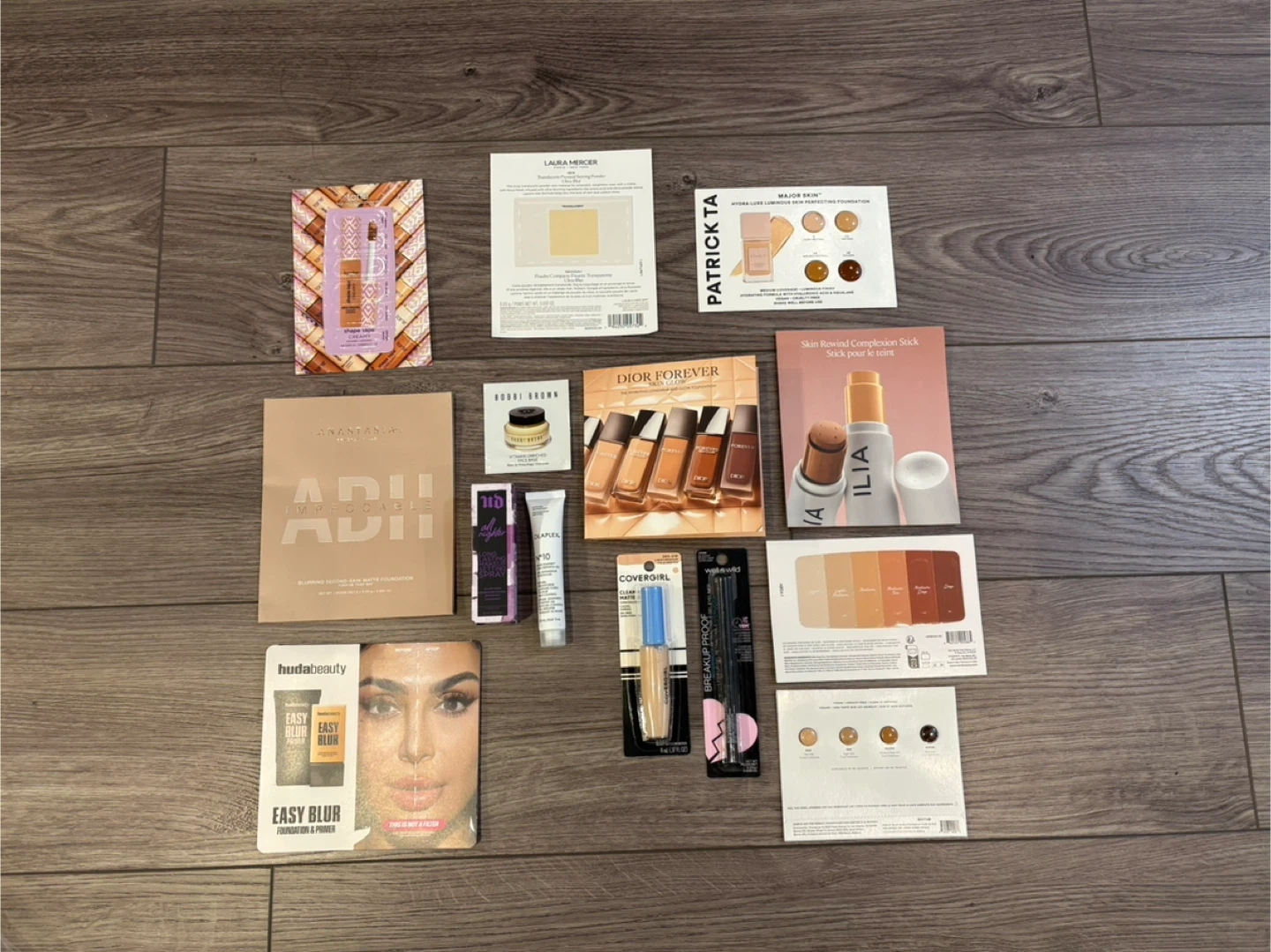 A collection of makeup samples featuring brands like Laura Mercier, Dior Forever, Huda Beauty Easy Blur, Patrick TA, Bobbi Brown, Anastasia Beverly Hills (ABH), Ilia Skin Rewind Complexion Stick, Covergirl, and Wet n Wild. Perfect for trying out new products before committing to the full size.