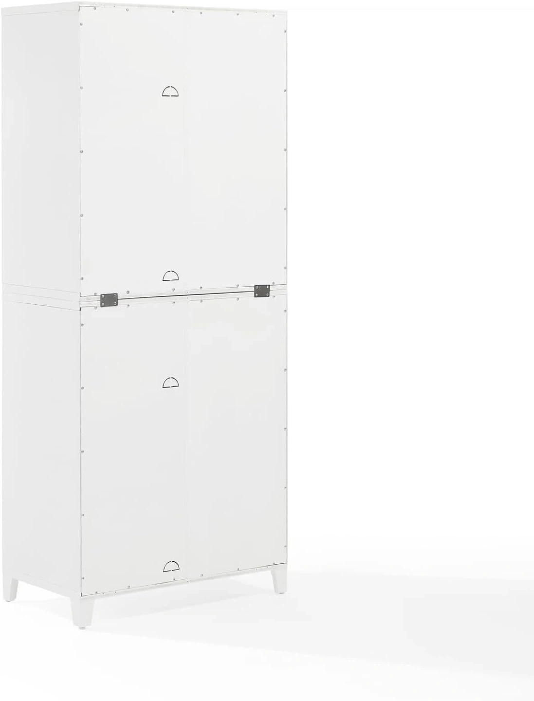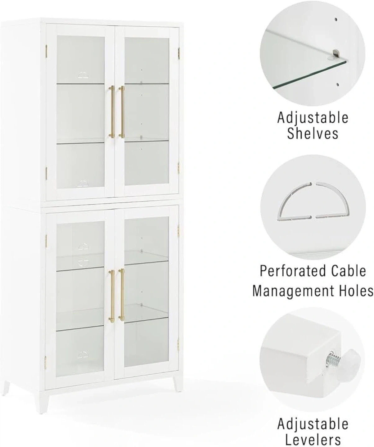 This two-tiered display cabinet features clear glass doors and gold-tone handles for a modern look. It has adjustable glass shelves for versatile storage and display. It's great for showcasing books, decor, or collectibles in any room.