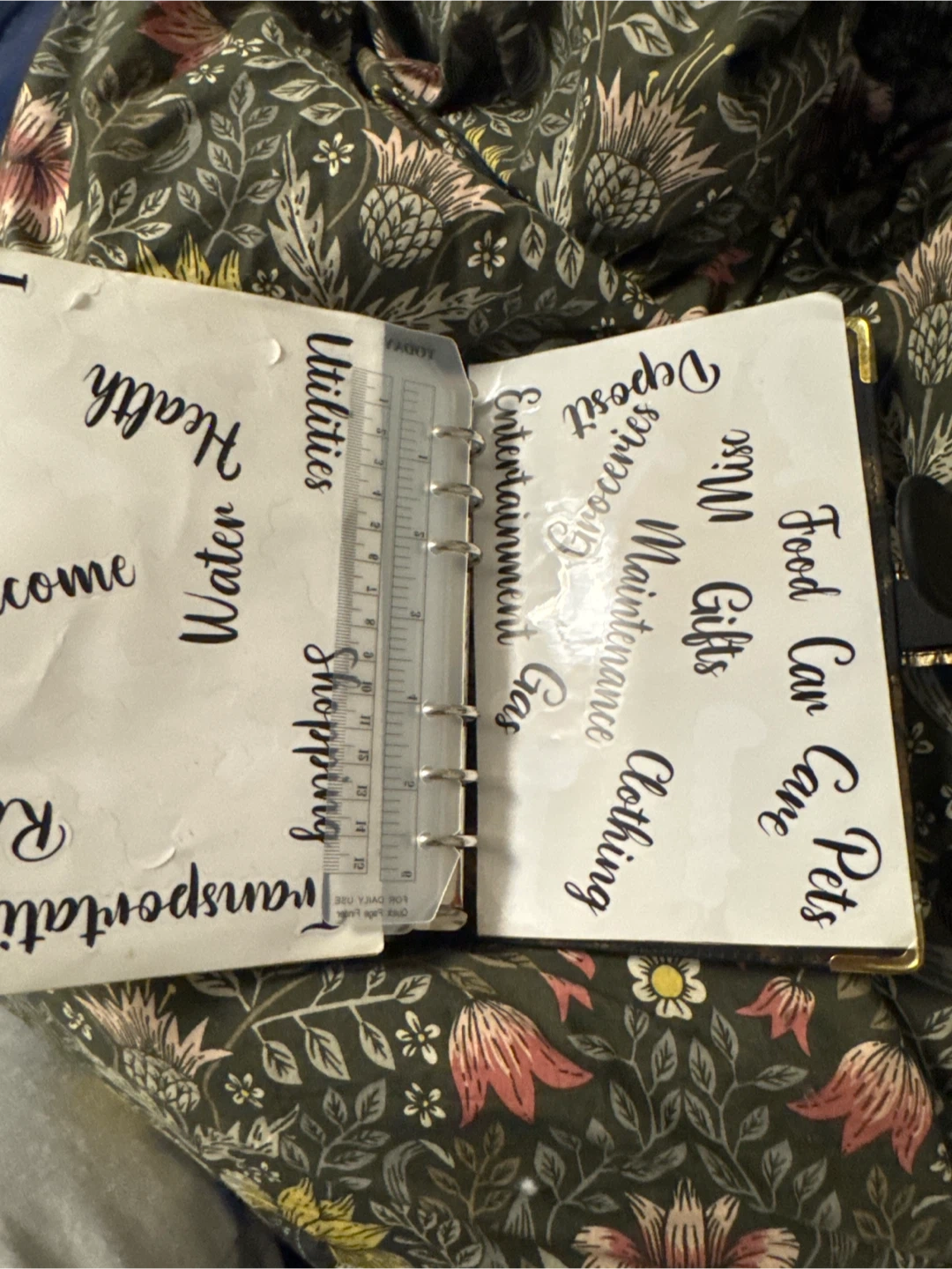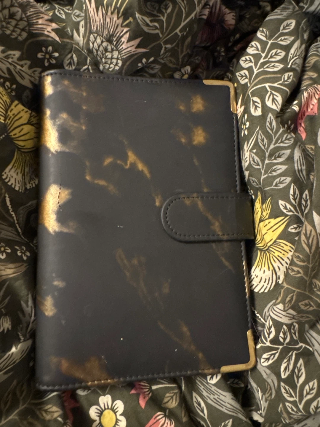 This budget binder has a stylish marble and gold exterior with a snap closure. It includes several labeled sections for various expenses, along with zipper pouches for cash. Perfect for anyone wanting to get organized with their finances!