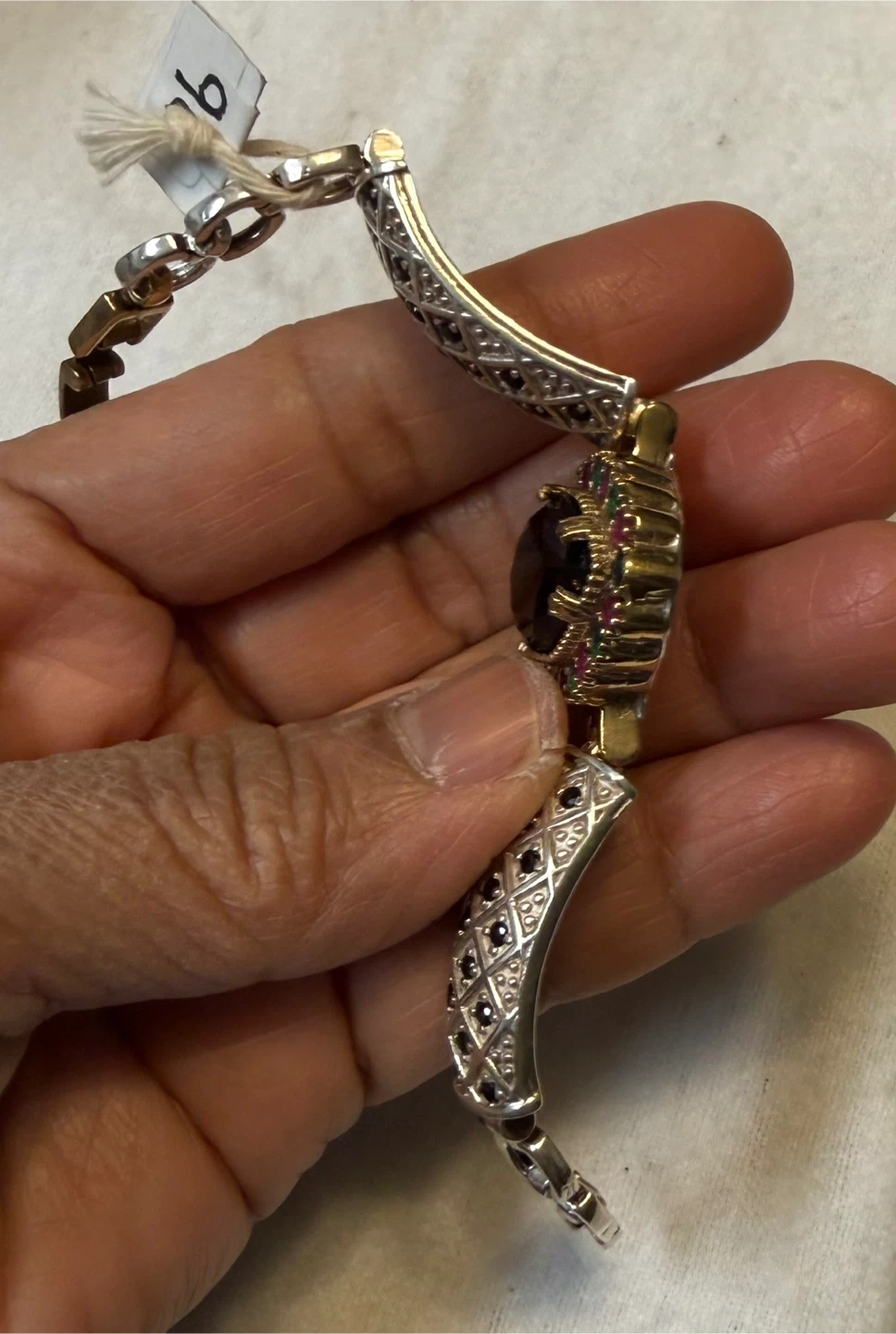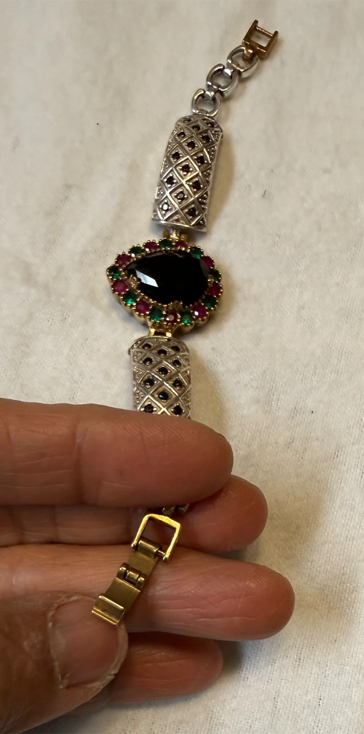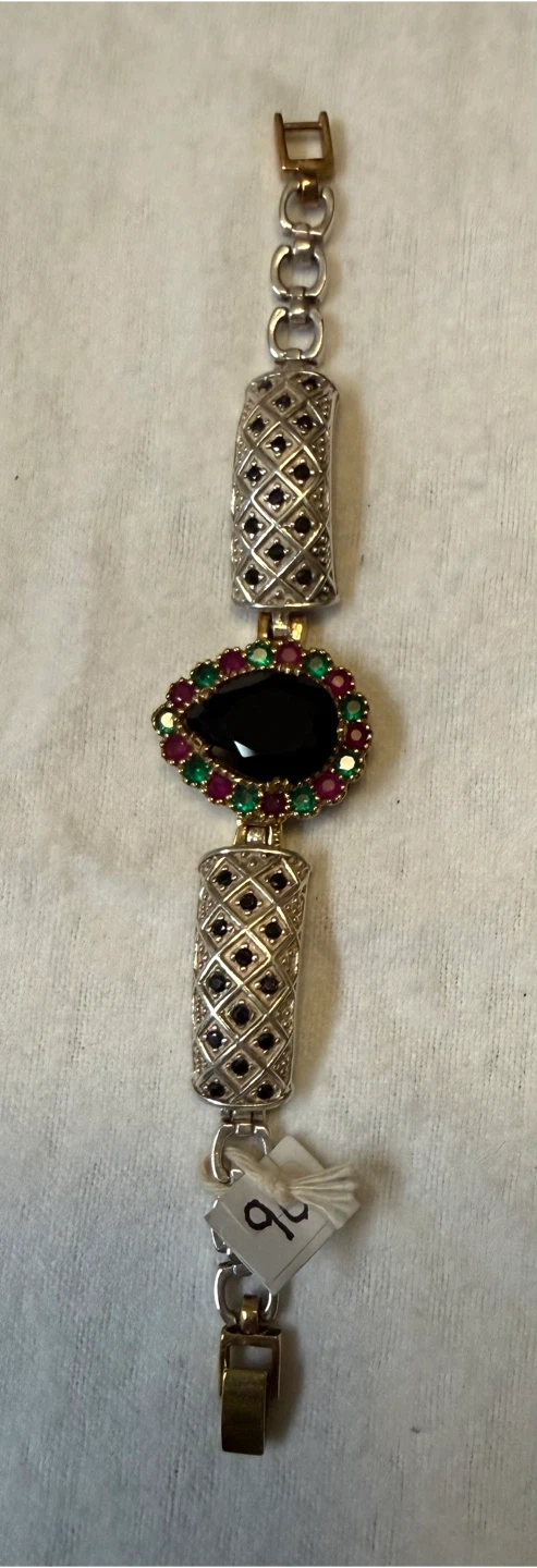This sterling silver bracelet features a large, teardrop-shaped black dark blue stone. It's surrounded by a halo of small round red and green stones. The bracelet links have a patterned design, and it closes with a secure clasp.