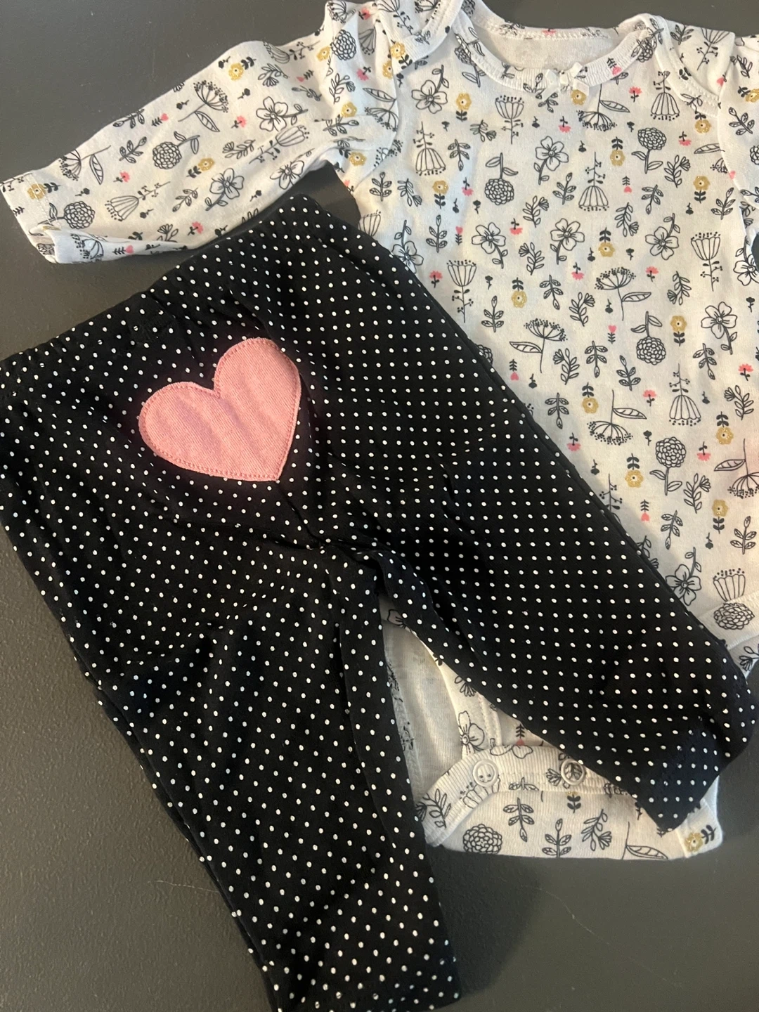 A super cute 3-piece outfit set from Child of Mine! Includes a pink "Little Sister" top, a floral onesie, and black polka dot pants with a pink heart detail. Perfect for your little one! Size 0 to 3 months. Item comes from a pet and smoke free home. Port union/401/Pickering for pick up. Note the prices for one, but I actually have two items the same.