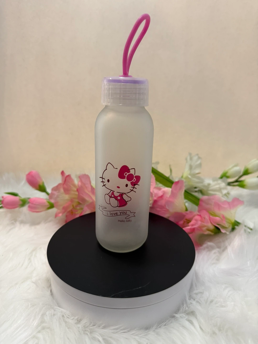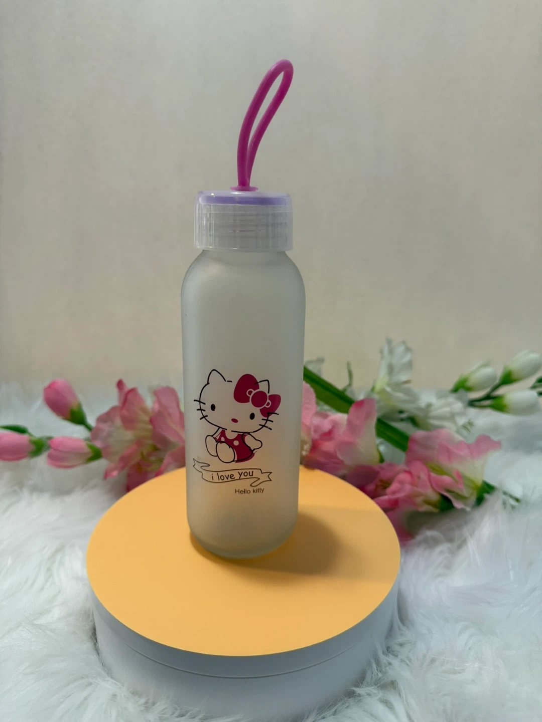 This is a frosted glass water bottle featuring Hello Kitty. It has a pink loop attached to the lid for easy carrying. It's great for on-the-go hydration!
