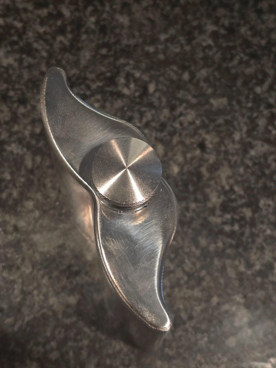 A Dr. McGillicuddy's stainless steel hip flask. It's shaped like a whale's tail. The flask has a screw-on cap. Believe it is 8 Oz.