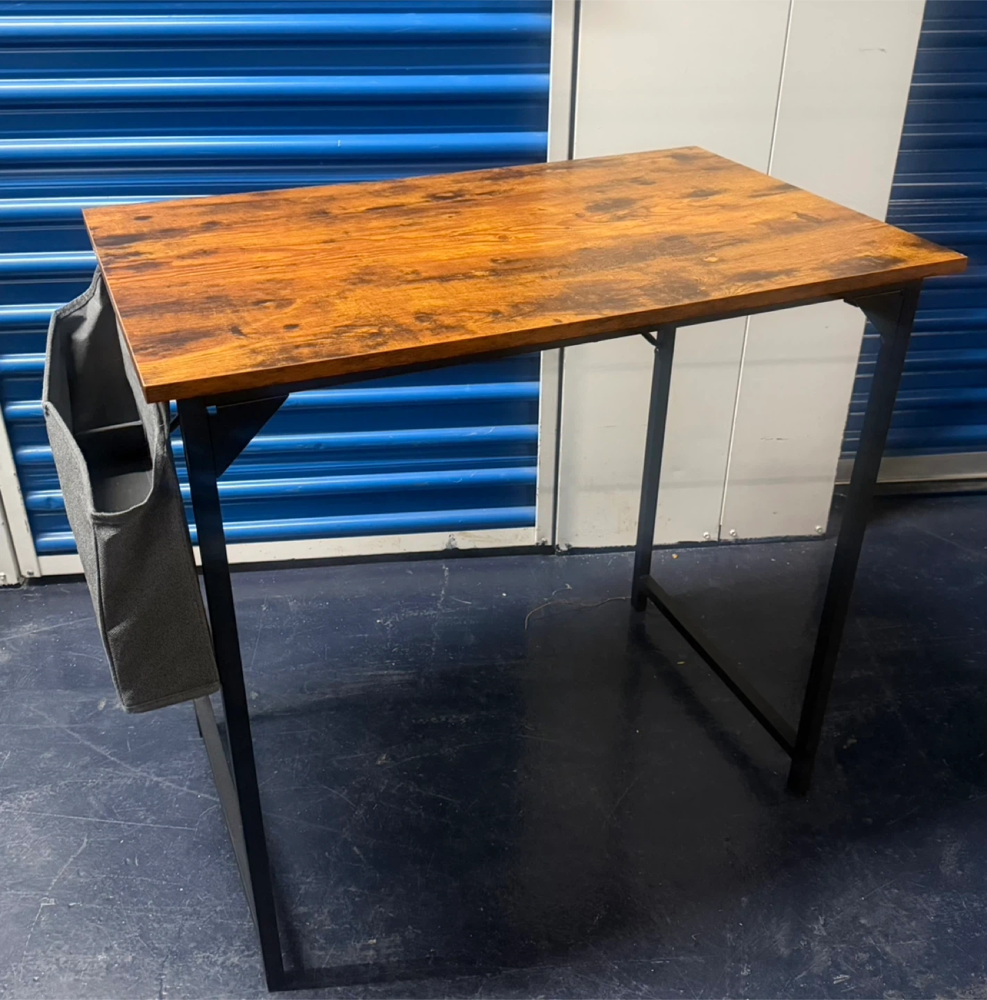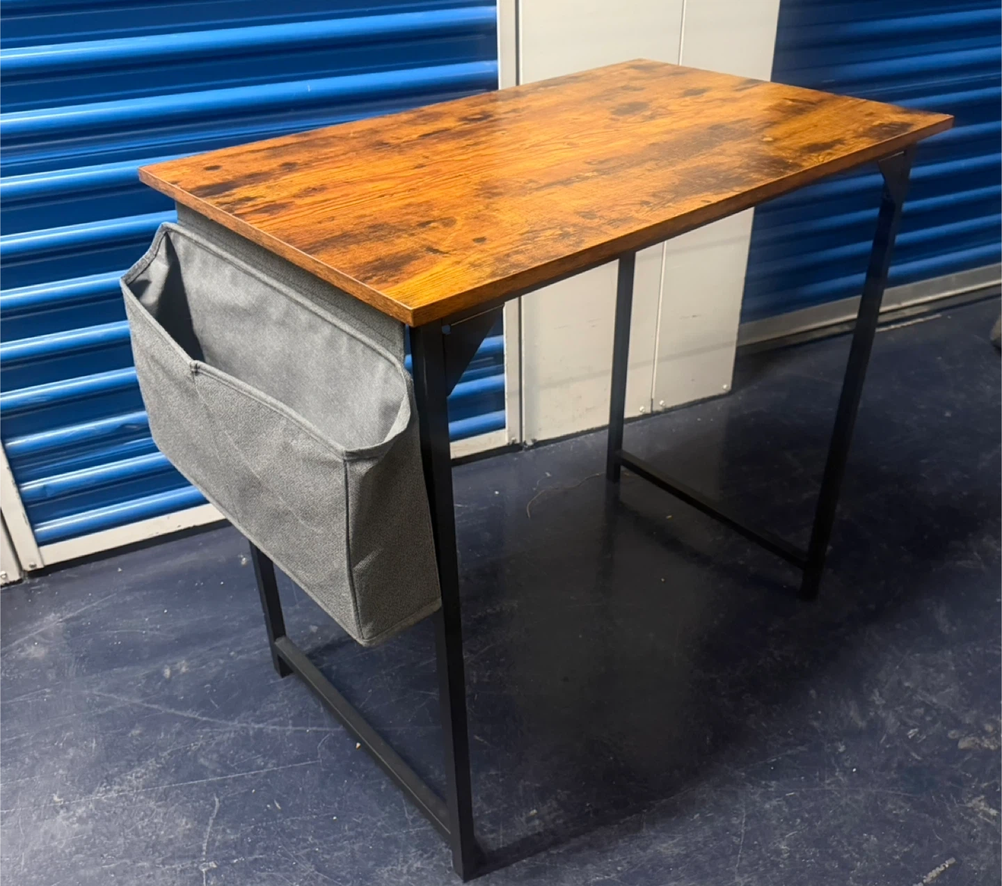 This compact desk features a rustic wood-look top and a black metal frame. It includes a convenient gray fabric storage pouch attached to the side for easy organization. It's a simple setup for small spaces!