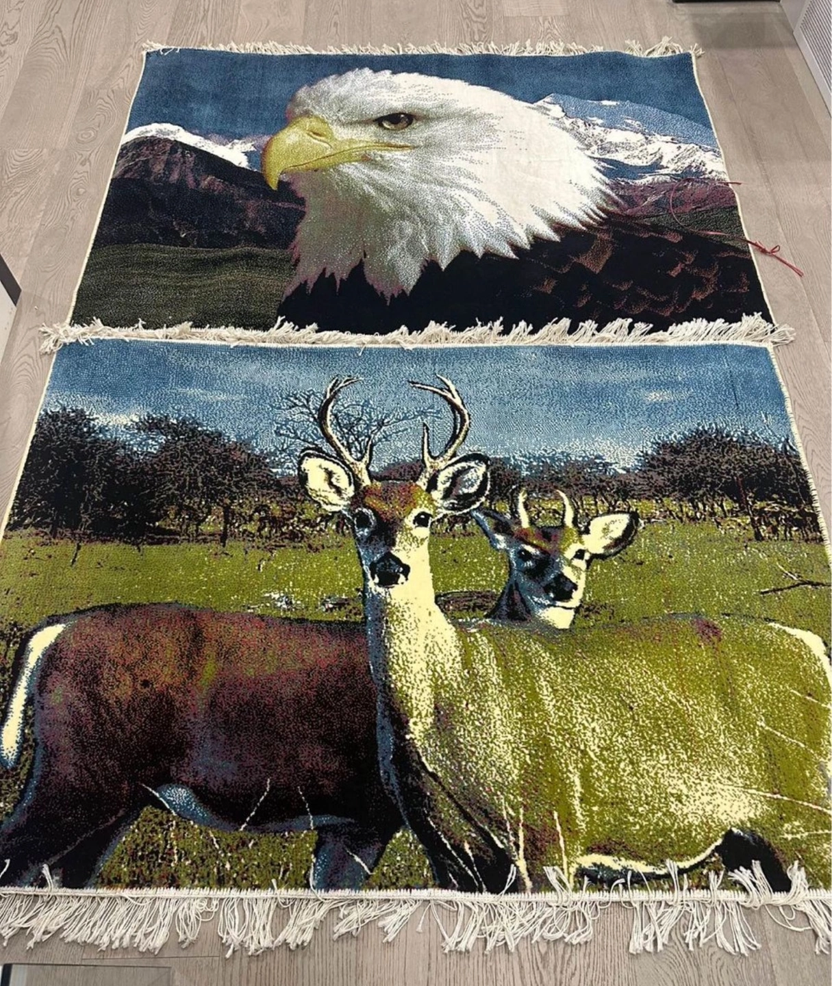 Two wall tapestries, one with an eagle and the other with deer. Both have fringed edges.