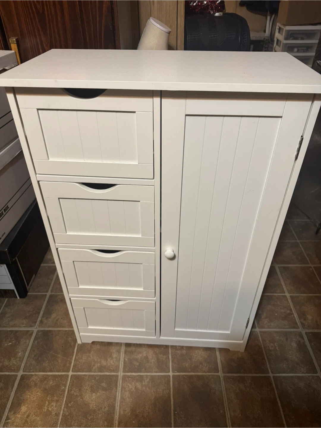 This white storage cabinet offers a mix of drawers and a shelved cupboard. It's perfect for organizing various items in your home. The unit features a louvered door and handles on the drawers. Asking $30 or best offer.